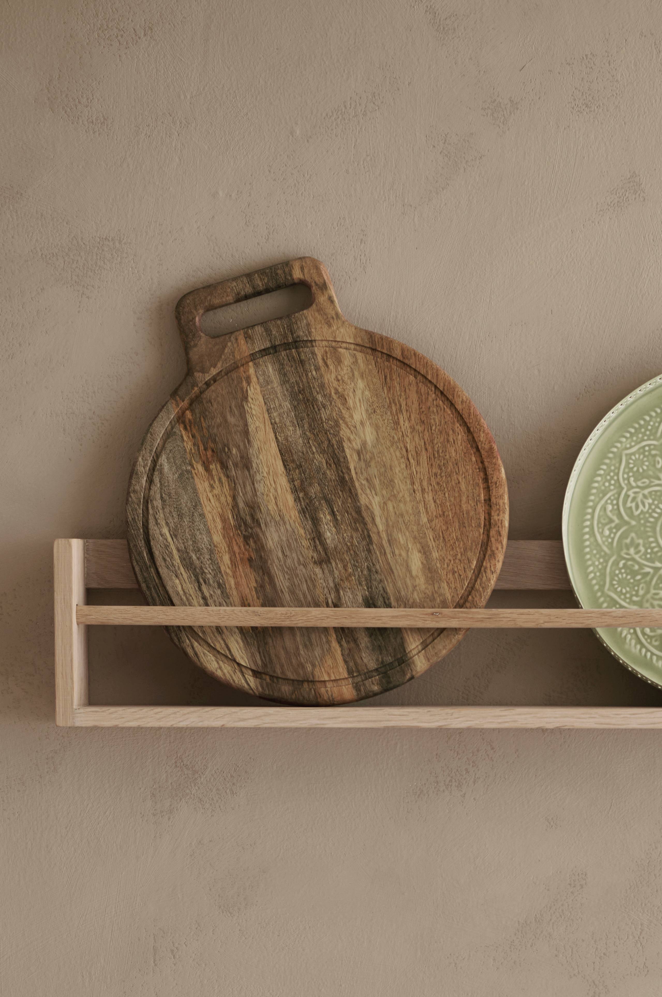 Rund skärbräda av mangoträ med handtag.