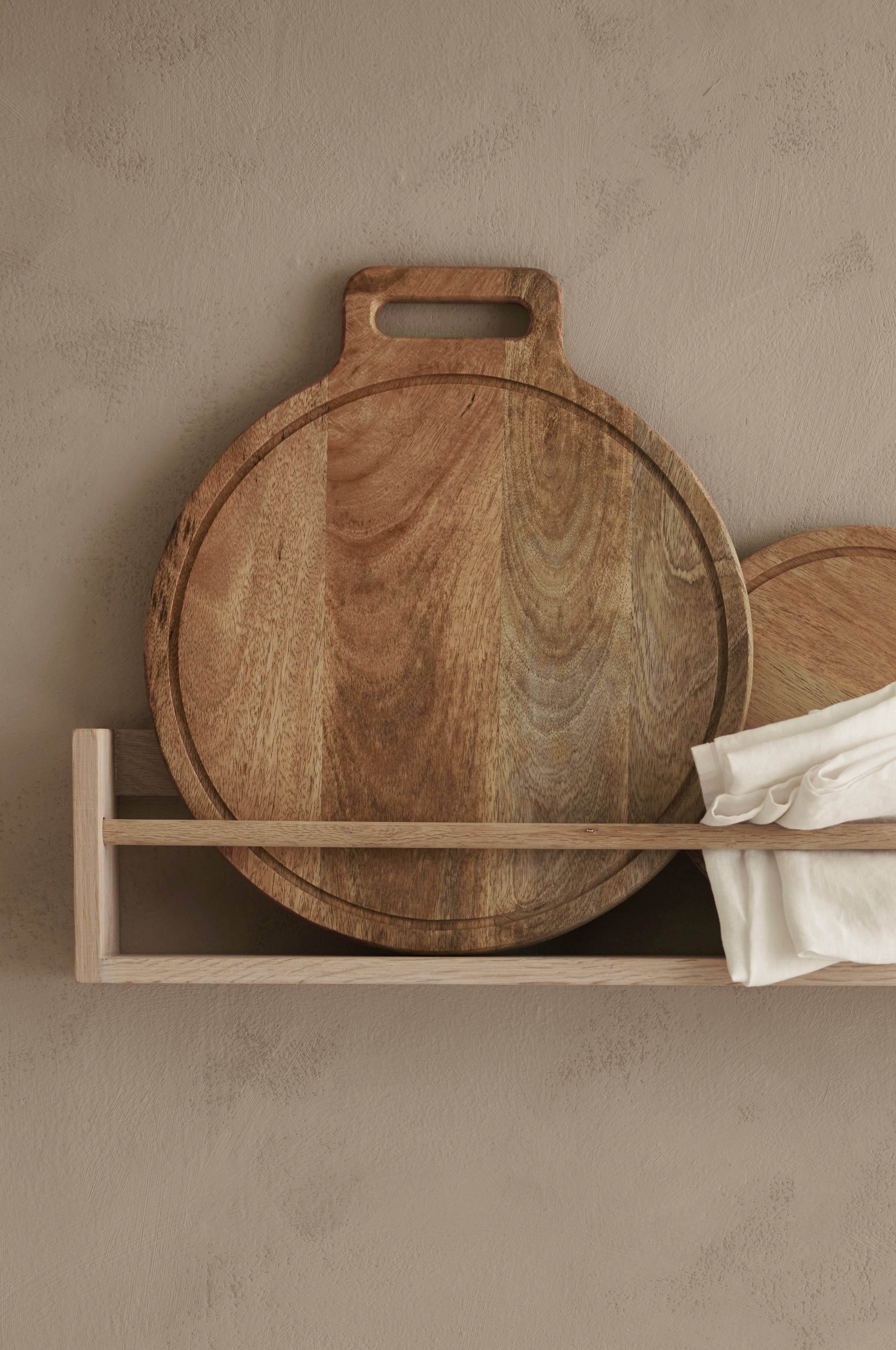 Rund skärbräda av mangoträ med handtag.
