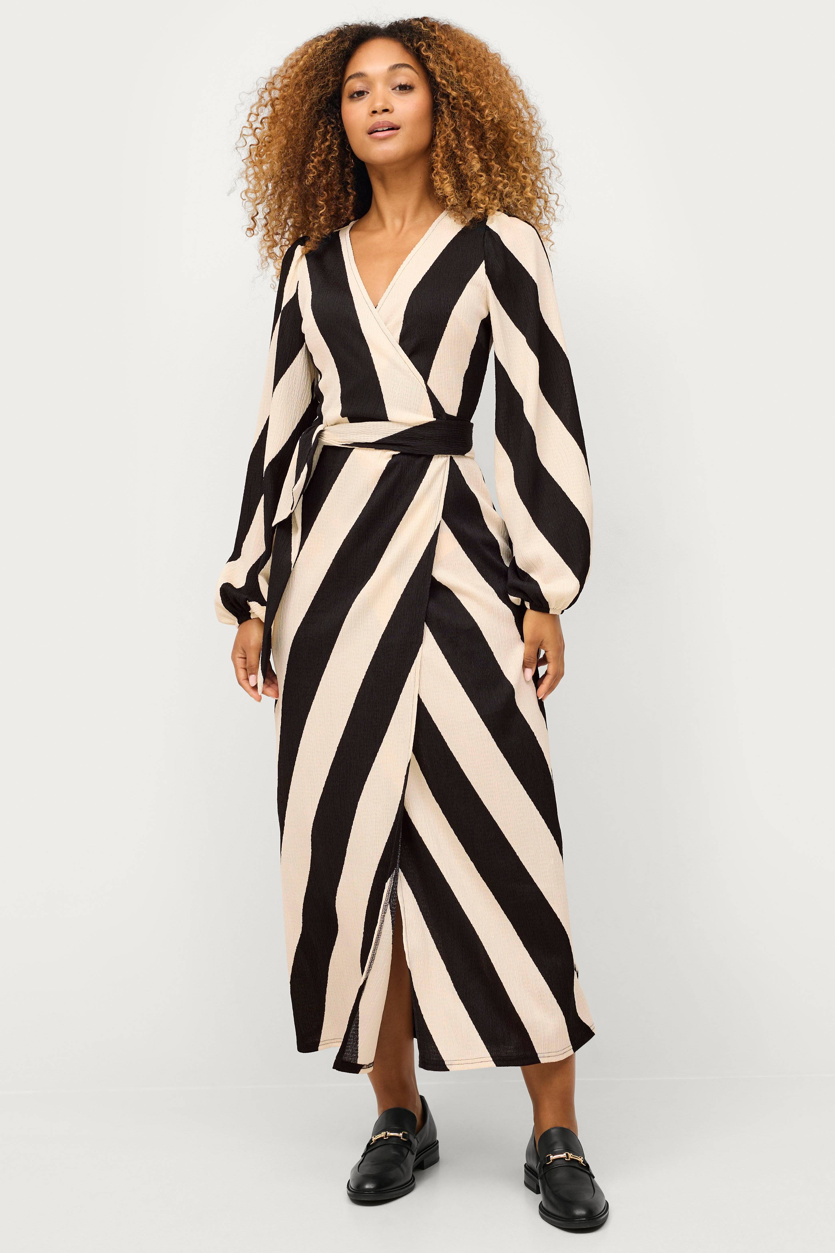• Lång omlottklänning• Brett knytband i sidan• Ballongärmar med elastiska ärmslut• Kvalitet med struktur• Längd: 133 cm i storlek 34/36