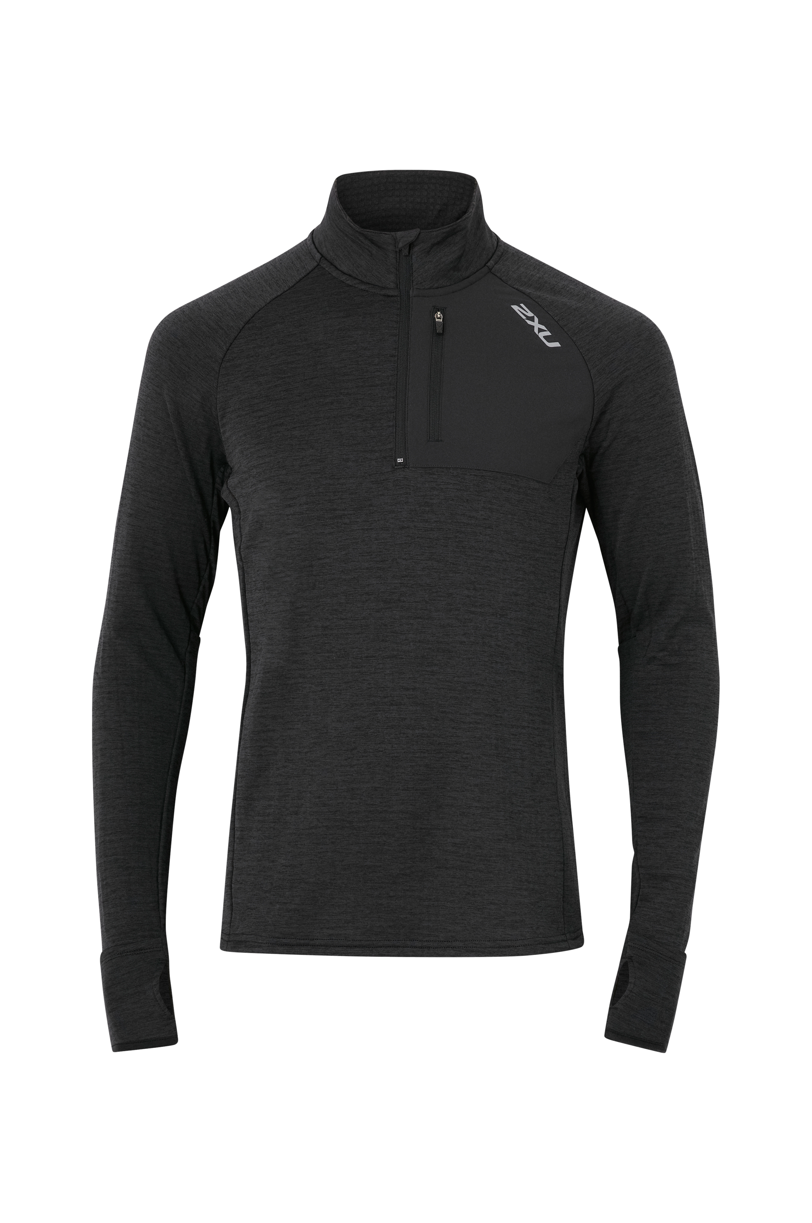 Funktionströja med en återvunnen dubbelstickad våffelstruktur som skapar små luftfickor som fångar kroppsvärmen, ökar andningsförmågan och gör plagget mer snabbtorkande. Ståkrage och 1/4-lång dragkedja. Muddar med tumhål som kan vändas till vantar för att hålla händerna varma. En ficka med dragkedja upptill fram. Reflekterande logotyper.