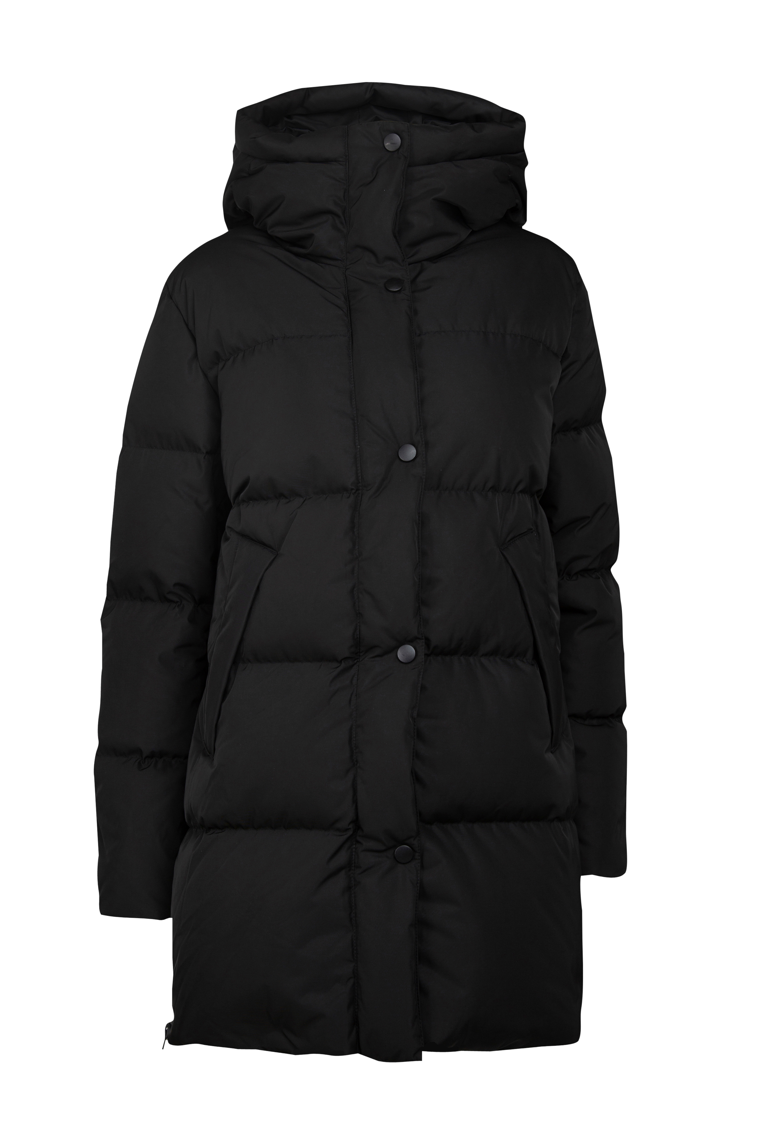 Fast, dunfylld huva. Hög krage, grov tvåvägsdragkedja från YKK och vindslå med tryckknappar. Två dragkedjor på sidornas nederkant som kan öppnas upp för extra rörelsefrihet. Två fickor med mjukt, värmande foder, skyddande lock och dragkedjor. Innerficka med dragkedja innanför knappslån. Längd ca 85 cm i stl 36.