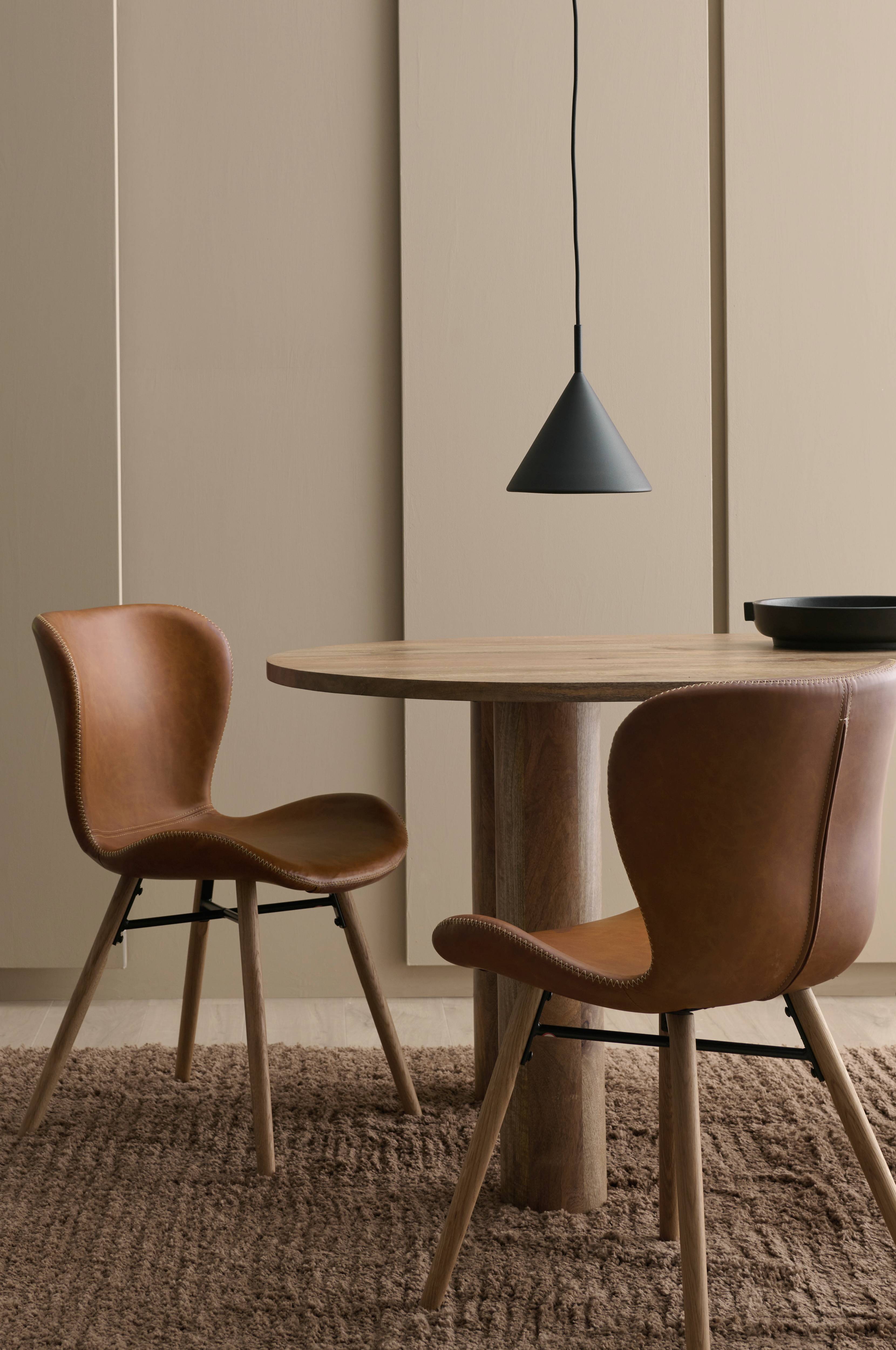 Stol i 2-pack med stoppad sits och klädsel av konstläder. Ben av massiv ek. Höjd 82,5, bredd 47, djup 56 cm. Sitthöjd 47, sitt djup 40 cm. Montera själv.