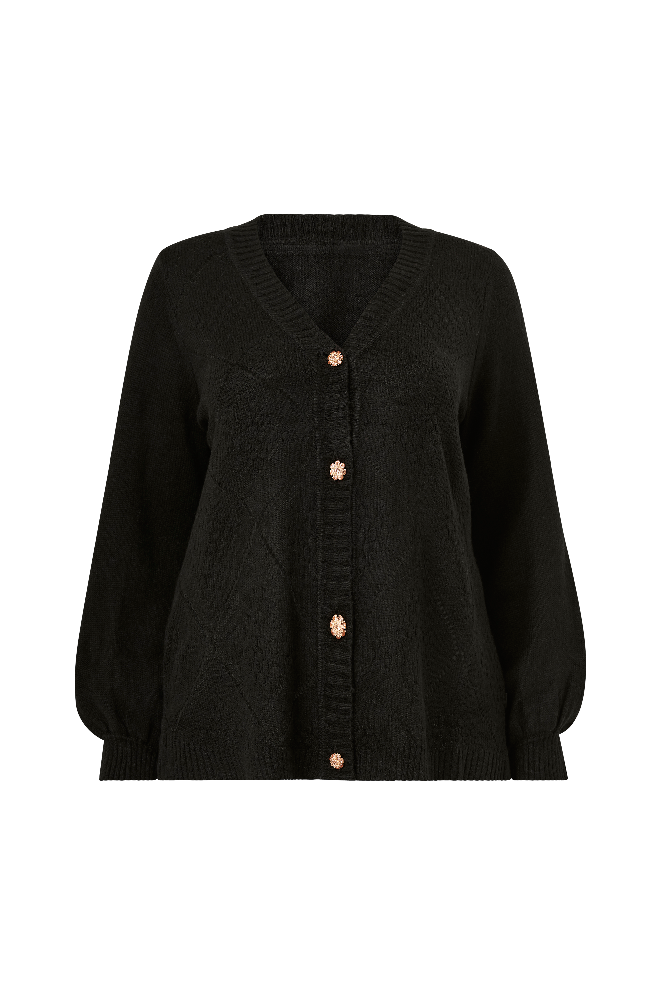 • Plusstorlekar• Ledig modell med mönsterstickning fram• V-ringad hals• Guldfärgade knappar med strass• Vid ärm• Ribbstickning i ärmsluten och i nederkanten