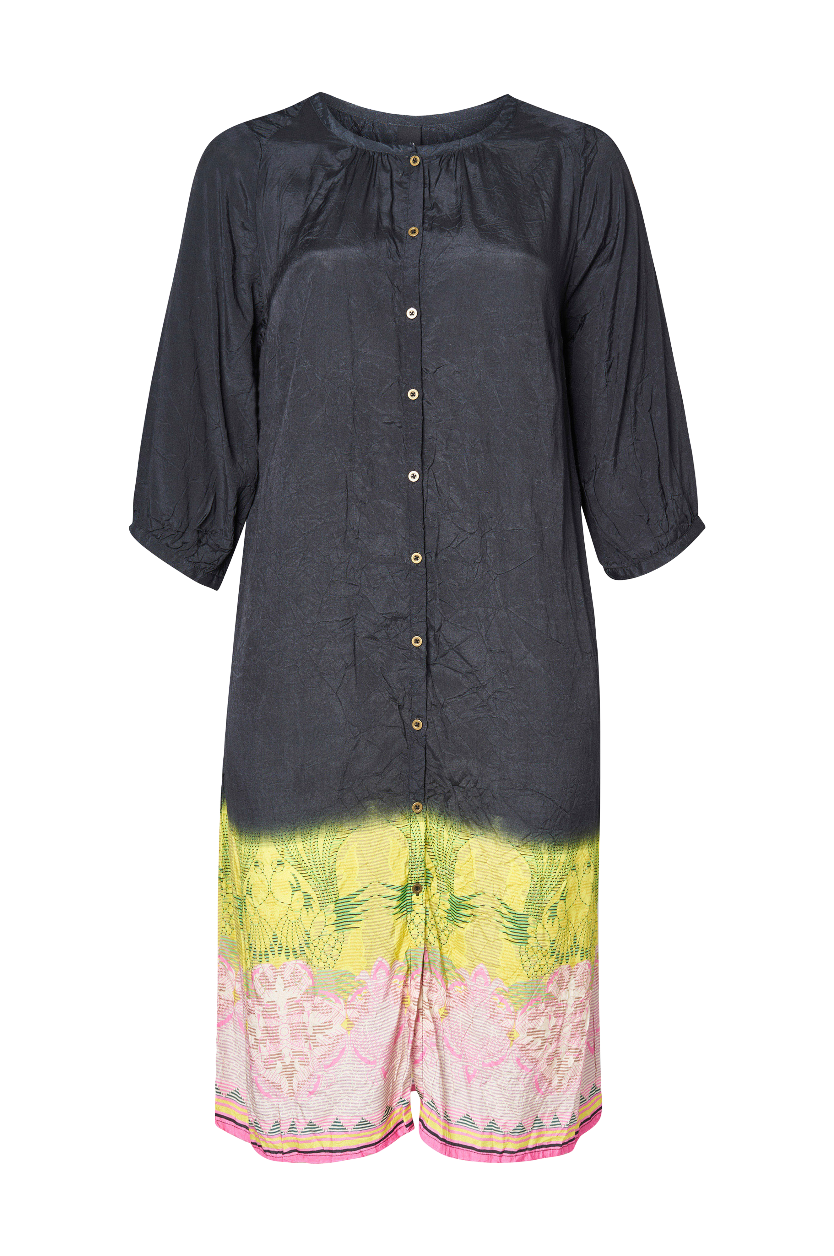 • Knappar fram• Vida ärmar• Fickor i sidorna• Plusstorlekar• Dekorativt skrynklig kvalitet med lyster• Längd: 131 cm i storlek S
