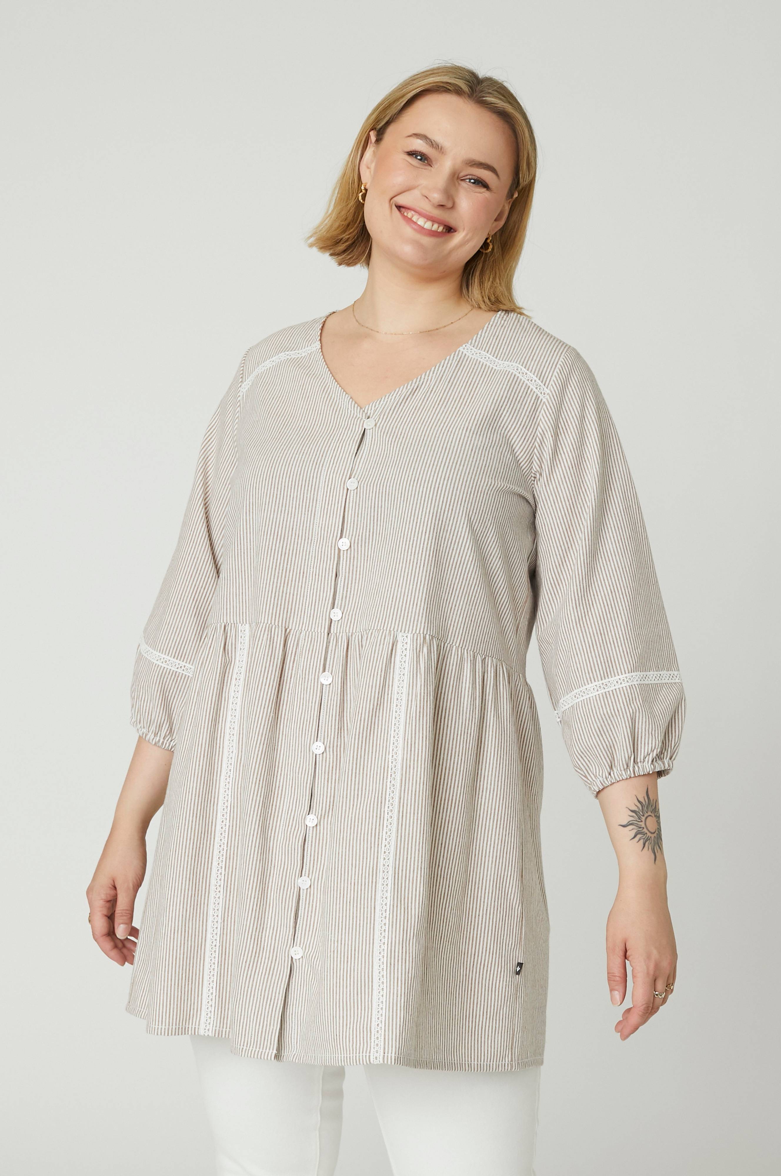 • Tunika i bomullsmix• V-ringning• Knappar fram• 3/4-långa ärmar• Plusstorlekar• Längd: 80 cm i storlek S