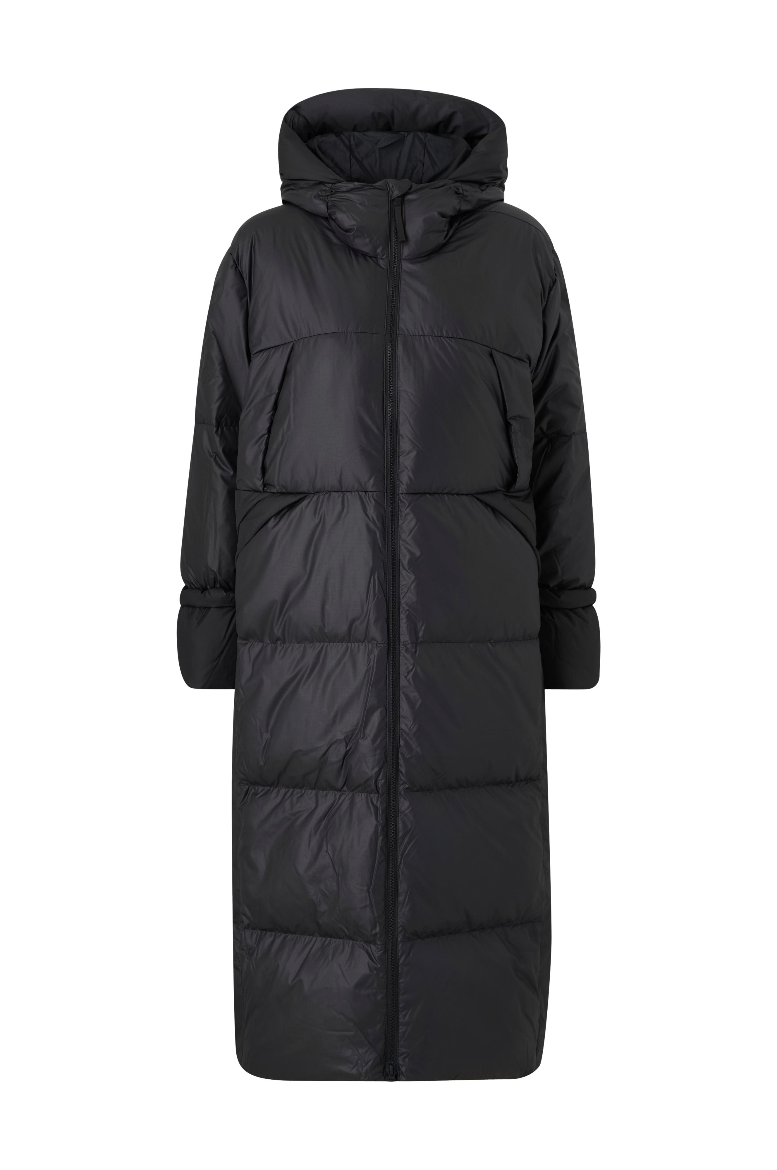 • Lång dunkappa med avslappnad passform • Vattenavvisande, vindavvisande yttertyg • Fast huva • Tvåvägsdragkedja • Innermuddar i stretchig trikå i ärmsluten • Höga slitsar med tryckknappar i sidorna • Fyra fickor upptill fram med tryckknappsstängning • Längd: 119 cm i storlek S