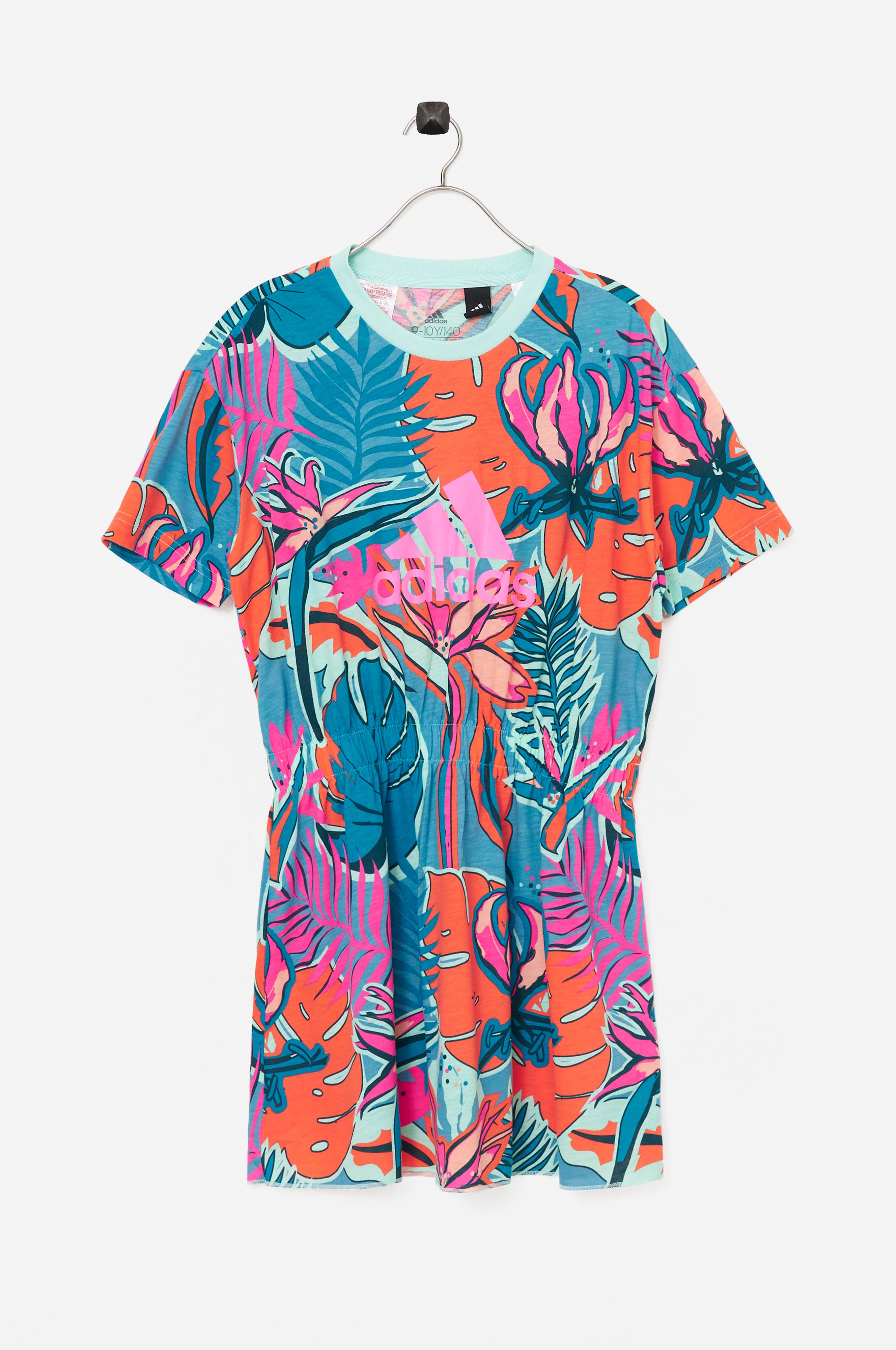 Kortärmad klänning i mjuk trikå med lös passform. Rund, ribbad halsringning och resår i midjan. Tryckt logga fram.