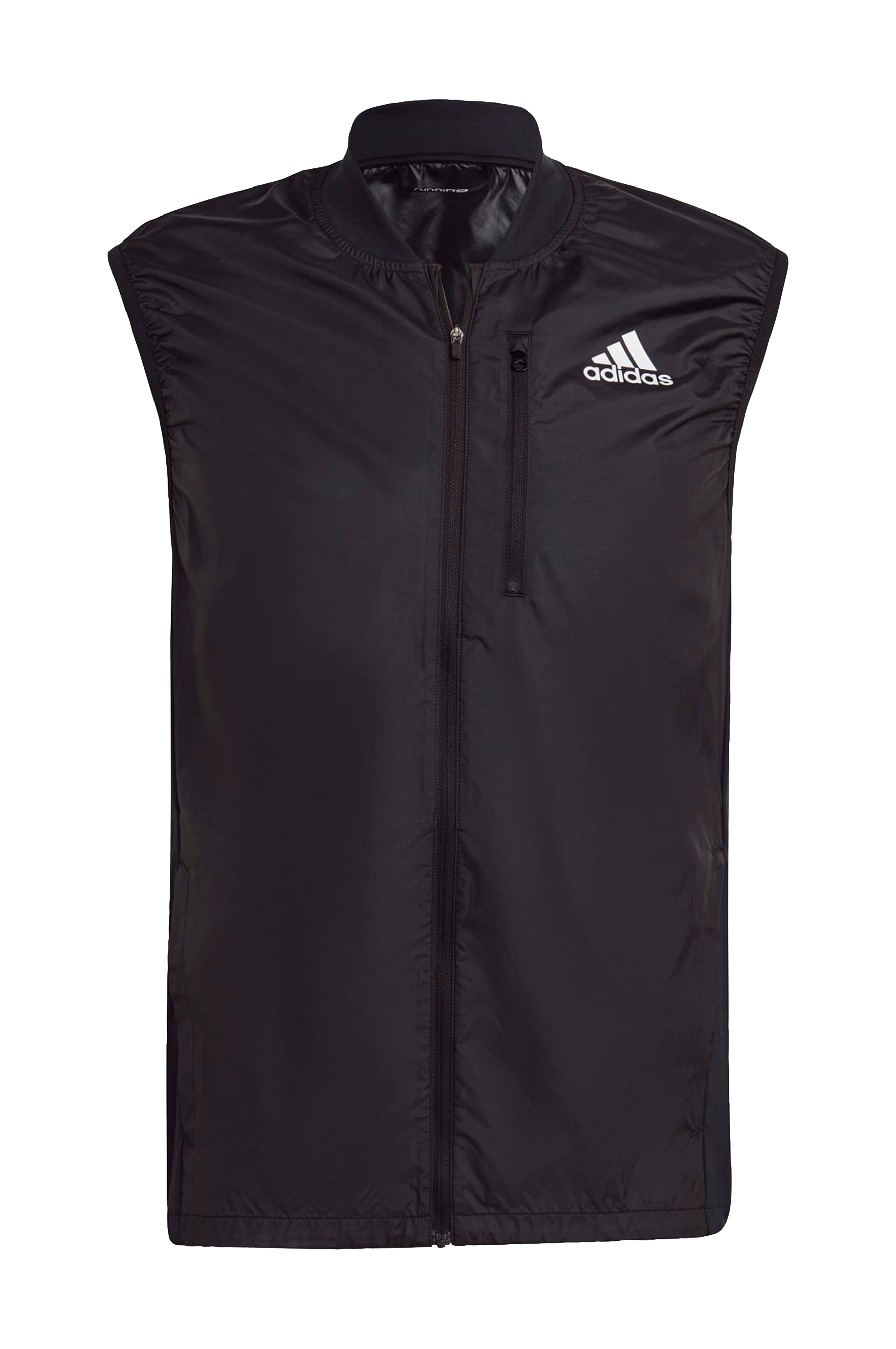 En löparväst för blåsiga dagar, gjord i ett vävt material med WIND.RDY som skyddar mot blåsten. Smal passform. Stretchiga paneler i sidorna och rund, hög krage i mjuk trikå. Dragkedja och en bröstficka med dragkedja. Längre bakstycke med dragsko i nederkanten. Reflextryckta detaljer.