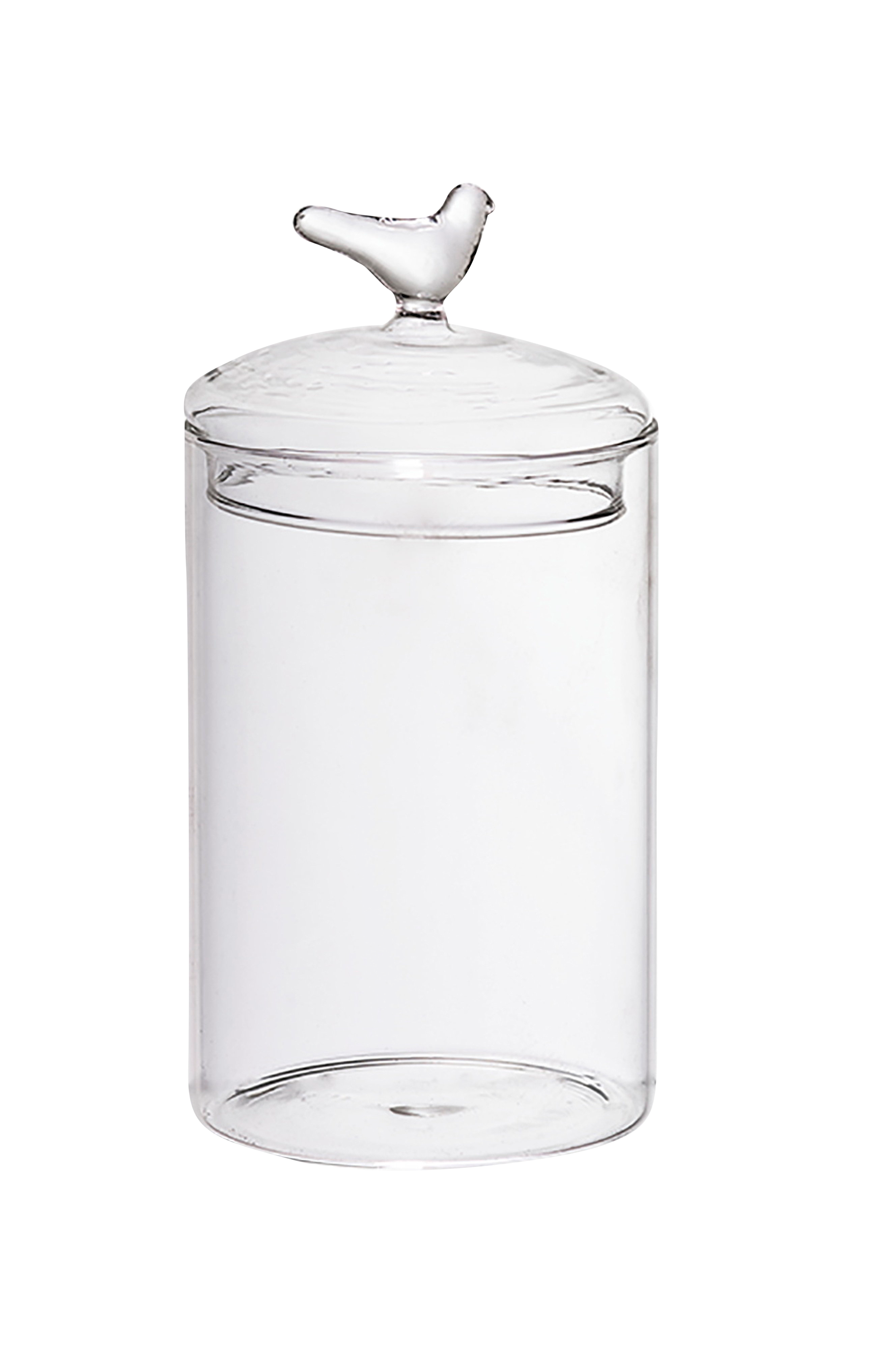 Glasburk med lock, dekorerad med en vacker fågel. Munblåst, därför kan bubblor och ojämnheter förekomma.