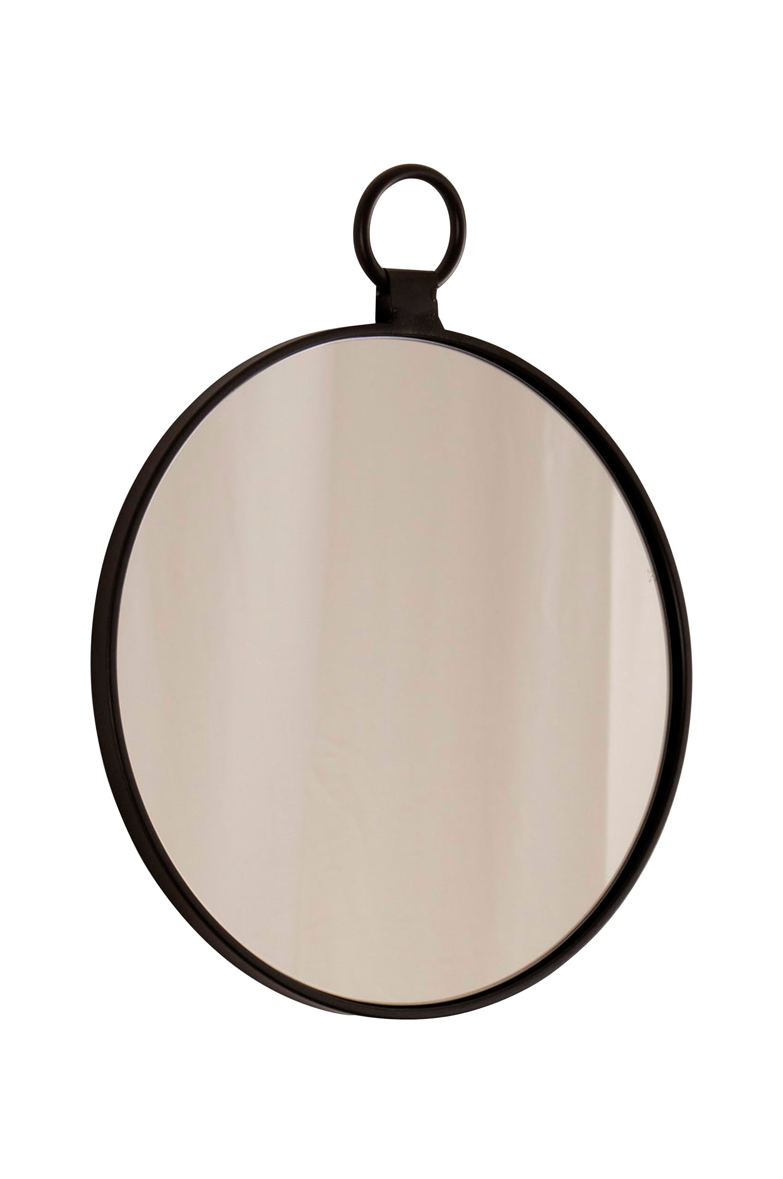 Spegel med silverfärgad metallram och dekorativ ring. Spegeln är 37 cm i höjd (inkl. ringen), 30 cm bred och 2 cm djup. Fästen för upphängning finns monterade på baksidan av spegeln.