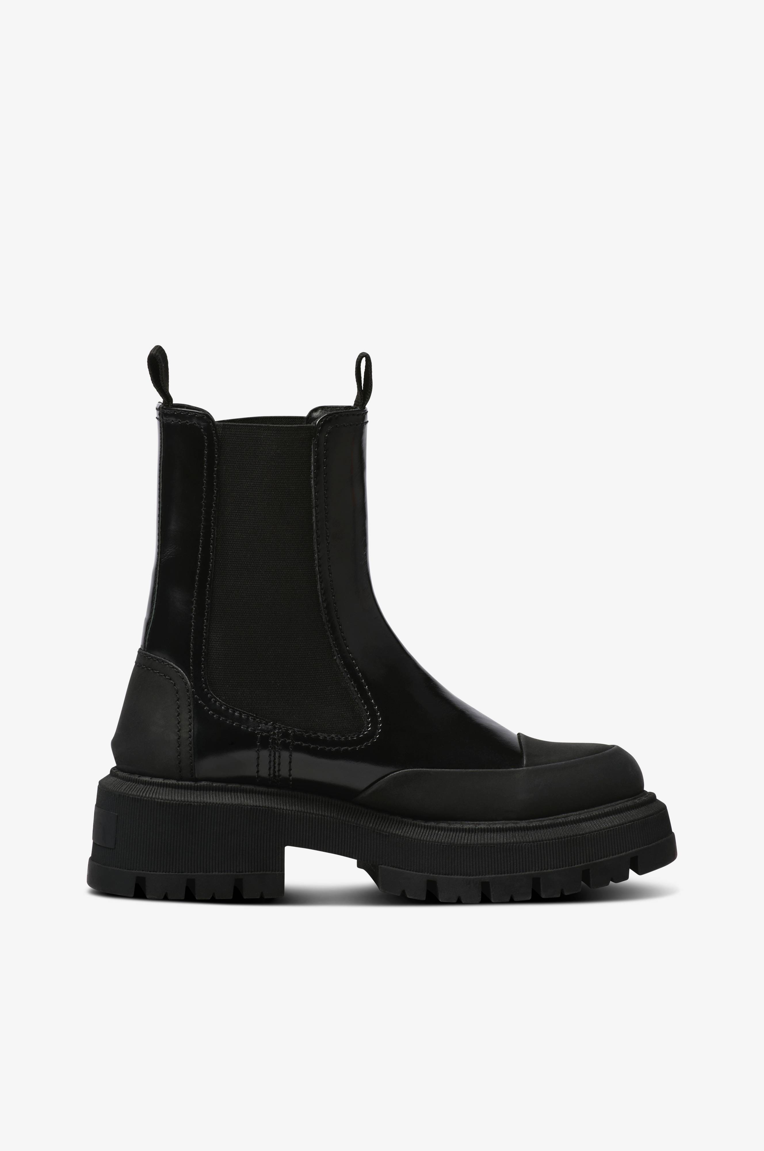 Läcker i läder, grova sulor, perfekt när det alltid är blött på vägen här