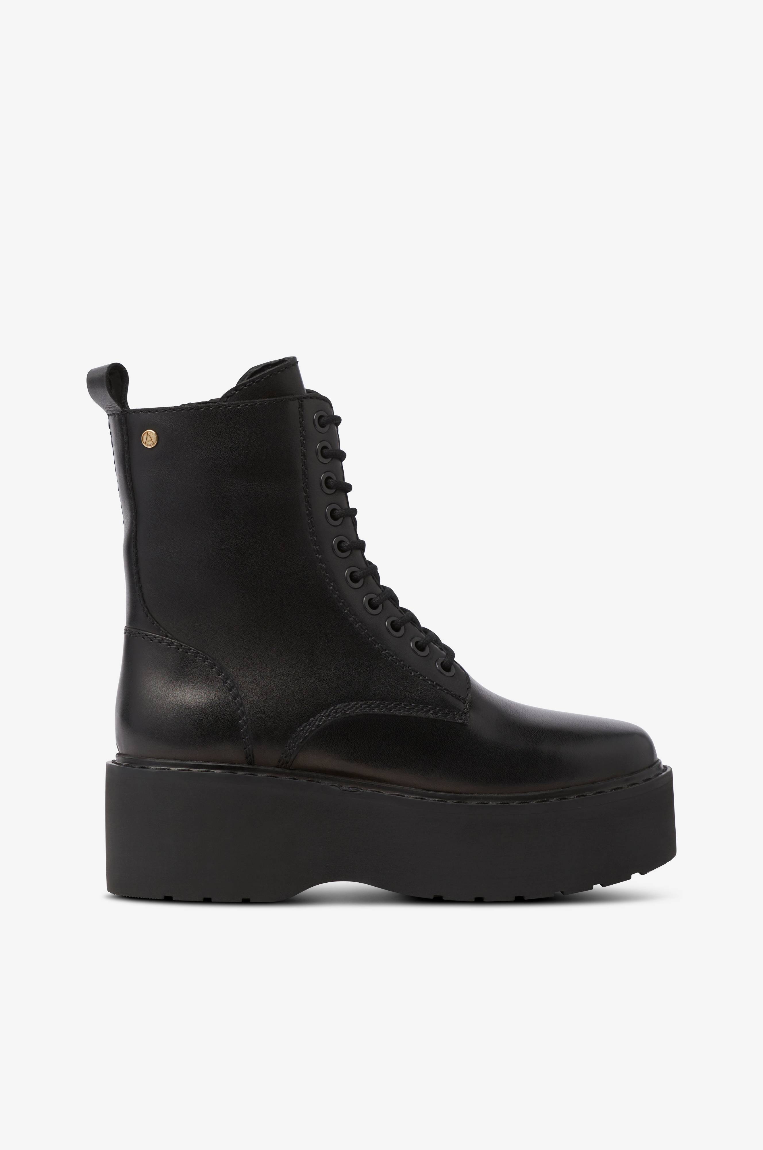Höga plattformkängor i slätt skinn. Snörning framtill och dragkedja på skaftets insida. Draghälla bak på skaftet och textilfodrad insida. Skafthöjd ca 15 cm. Klackhöjd ca 5,5 cm.