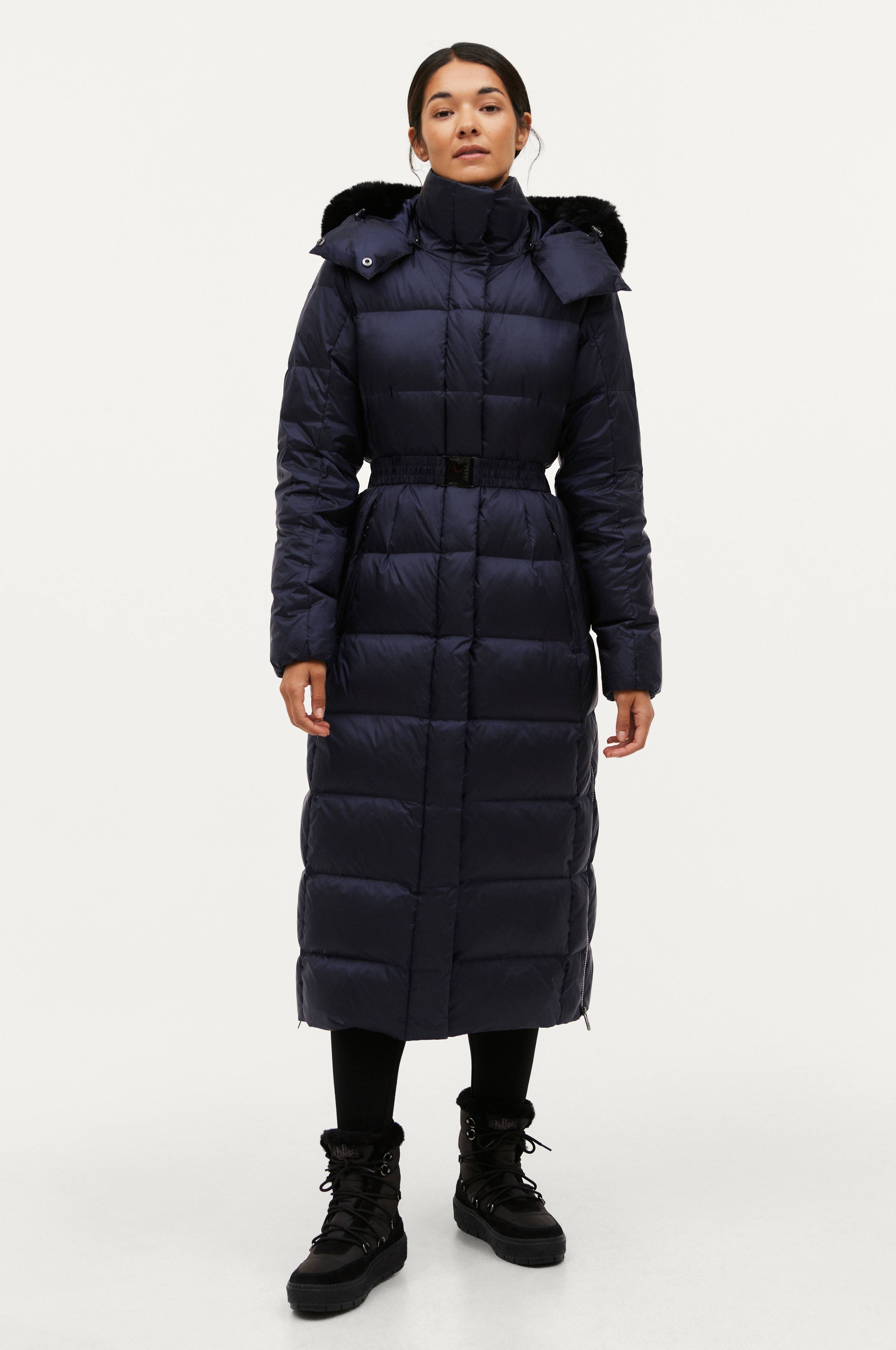 En varm, smidig och lätt kappa med fyllning av 90% dun och 10% fjäder. Fill power 760. Lång modell med vind- och vattenavvisande yttertyg.