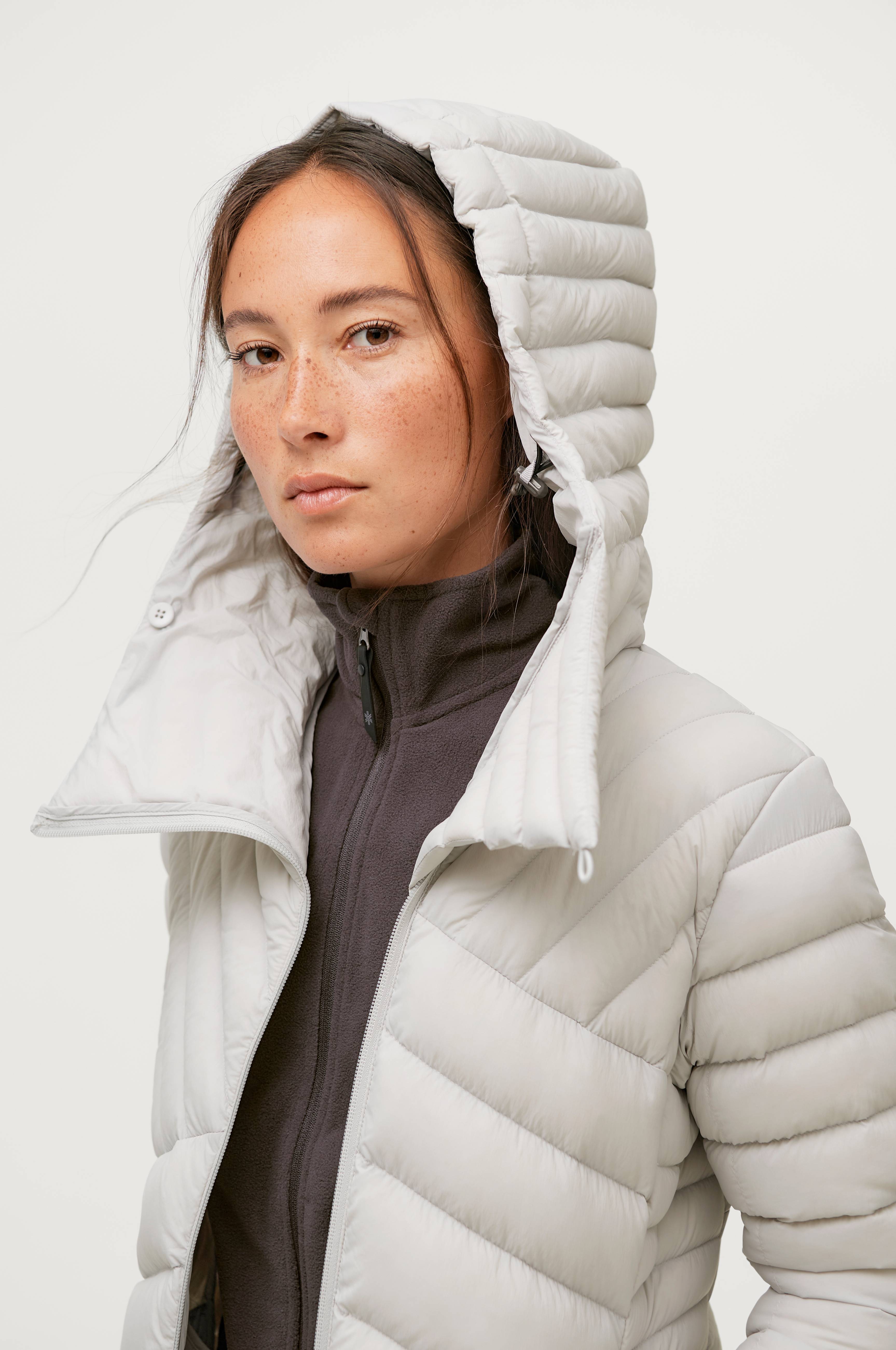 En lätt och smidig quiltad dunkappa från Áhkká by Renata med feminina, asymmetriska skärningar. Matt, vävt yttertyg. Fyllning av 90% dun och 10% fjäder. Fill power 600-650. Fast huva som har dragsko med stoppers och en stor, härlig krage som kan stängas till med en knapp. Tvåvägsdragkedja. Elastiska bandkanter i ärmslut och nedtill. Två fickor med dragkedja samt två öppna innerfickor. Längd ca 90 cm i stl 36.