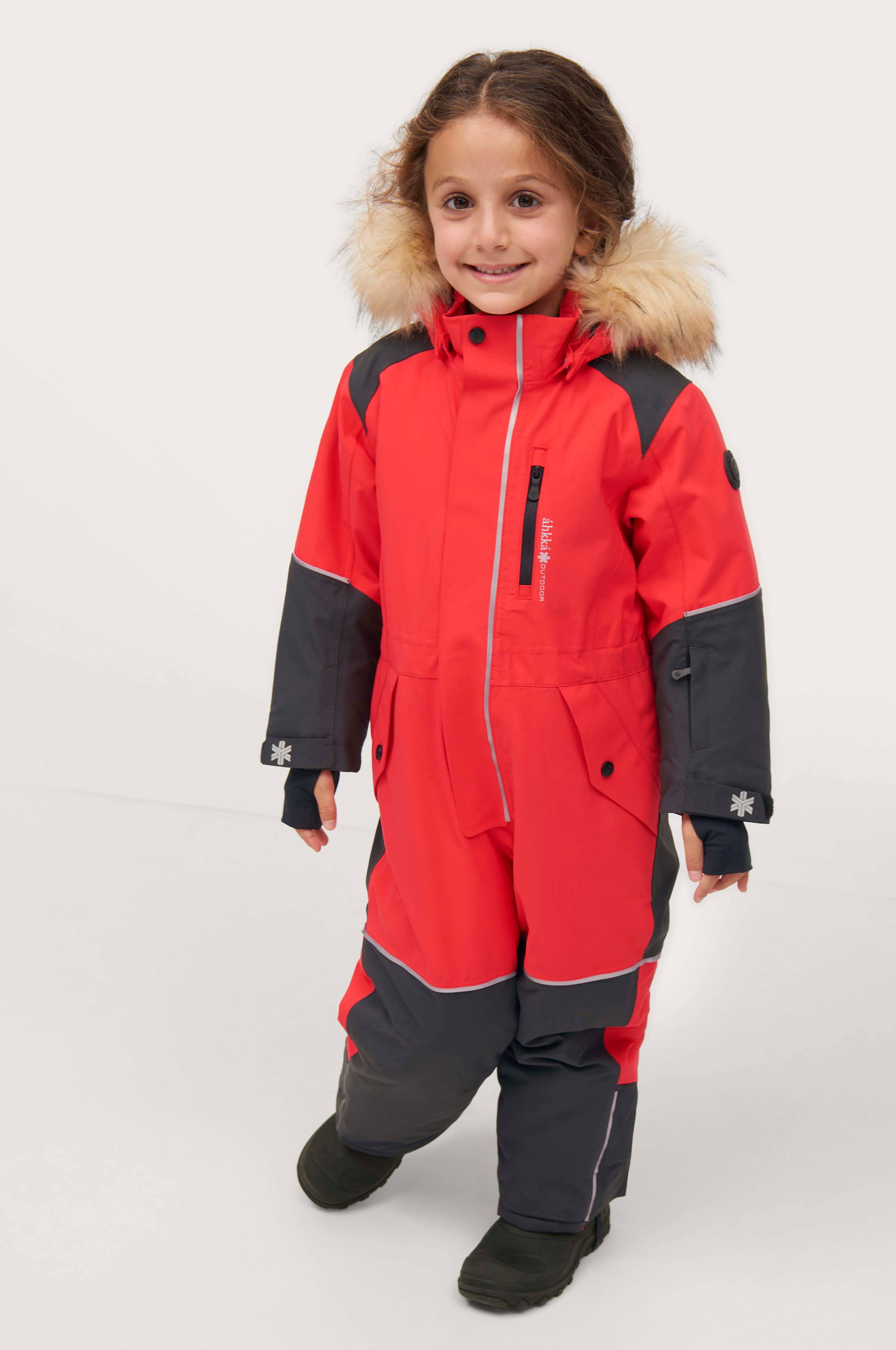 Avknäppbar och justerbar huva med avtagbar fuskpälskant. Hög krage med mjuk fleece på insidan. Dragkedja och en skyddande vindslå med kardborrestängning. Två fickor fram med dragkedjor och handvärmarfoder. Reglerbar vidd i midjan. Reglerbara ärmslut med kardborre och en invändig stretchig trikåmudd med tumhål. Elastiska snölås i benslut med antiglidband på insidan som håller dem på plats. Reglerbar vidd i bensluten och justerbara fothällor i gummi. Reflexdetaljer runt om.