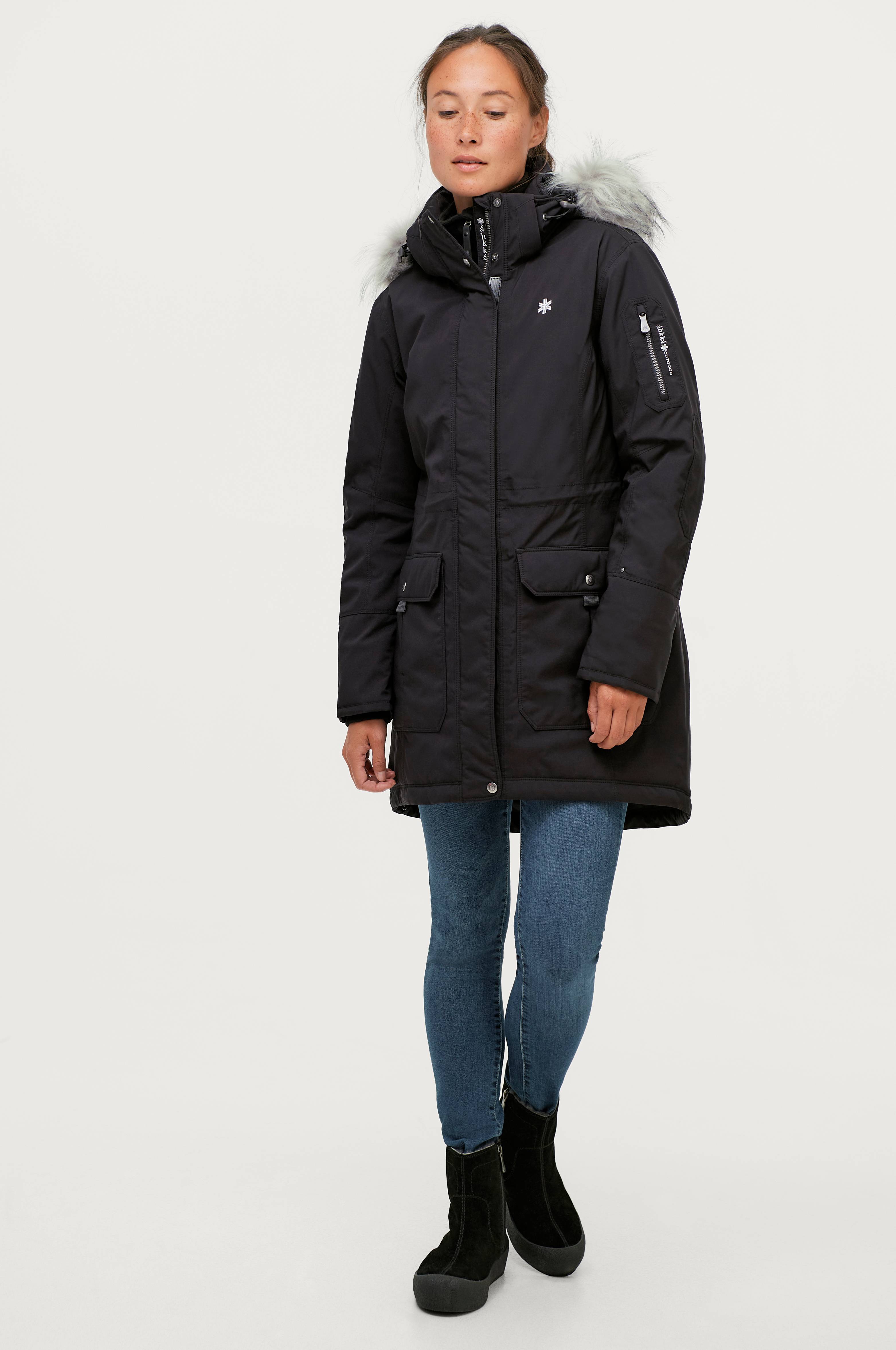 Avtagbar, justerbar huva med dragsko. Avtagbar kant i mjuk syntetpäls (grå vargimitation). Hög krage med borstad polyester på insidan och vid hakan. Kragen kan stängas till med två tryckknappar. Sladdhållare vid halsen. Jackan stängs med dragkedja under en skyddande vindslå med kardborrestängning. Dold innermudd i ärmslut av ribbstickad trikå. Invändig dragsko med stoppers i midja och nederkant för snygg och reglerbar passform. Två fickor med lock som stängs med kardborre och tryckknapp. En ficka på vänster ärm med dragkedja. En lodrät innerficka med dragkedja och mediauttag. Vävt, quiltat foder. Gummerad patch på höger ärm med detalj i metall. Längd bak ca 89 cm i stl 36.