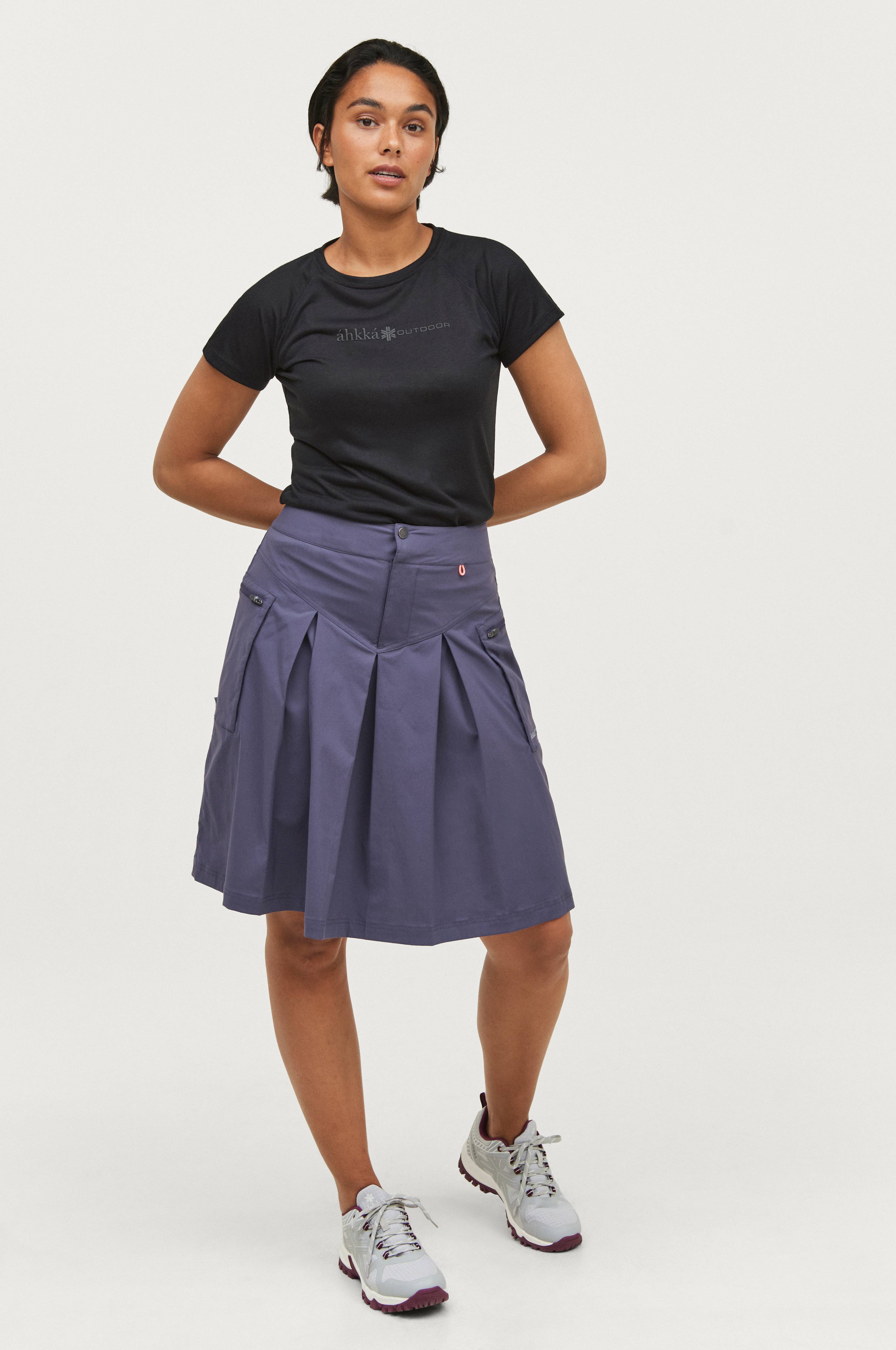 Trekkingkjol från Áhkká. En funktionell kjol i vävd, lätt kvalitet med stretch och mycket vidd som ger skön komfort och stor rörelsefrihet. Innerbyxa i smidig stretchtrikå. Kjolen är i det snabbtorkande tyget áphiTecQuick. Ett perfekt friluftsplagg när du vill vara lätt klädd ute, men ändå vara aktiv på t. ex. vandringen eller kajakturen. Stängning med tryckknapp och kardborre fram. Gylf med dragkedja. Elastisk ögla i linningen att fästa kåsan i. Två funktionella, påsydda fickor med dragkedja. Längd ca 59 cm i stl 36.