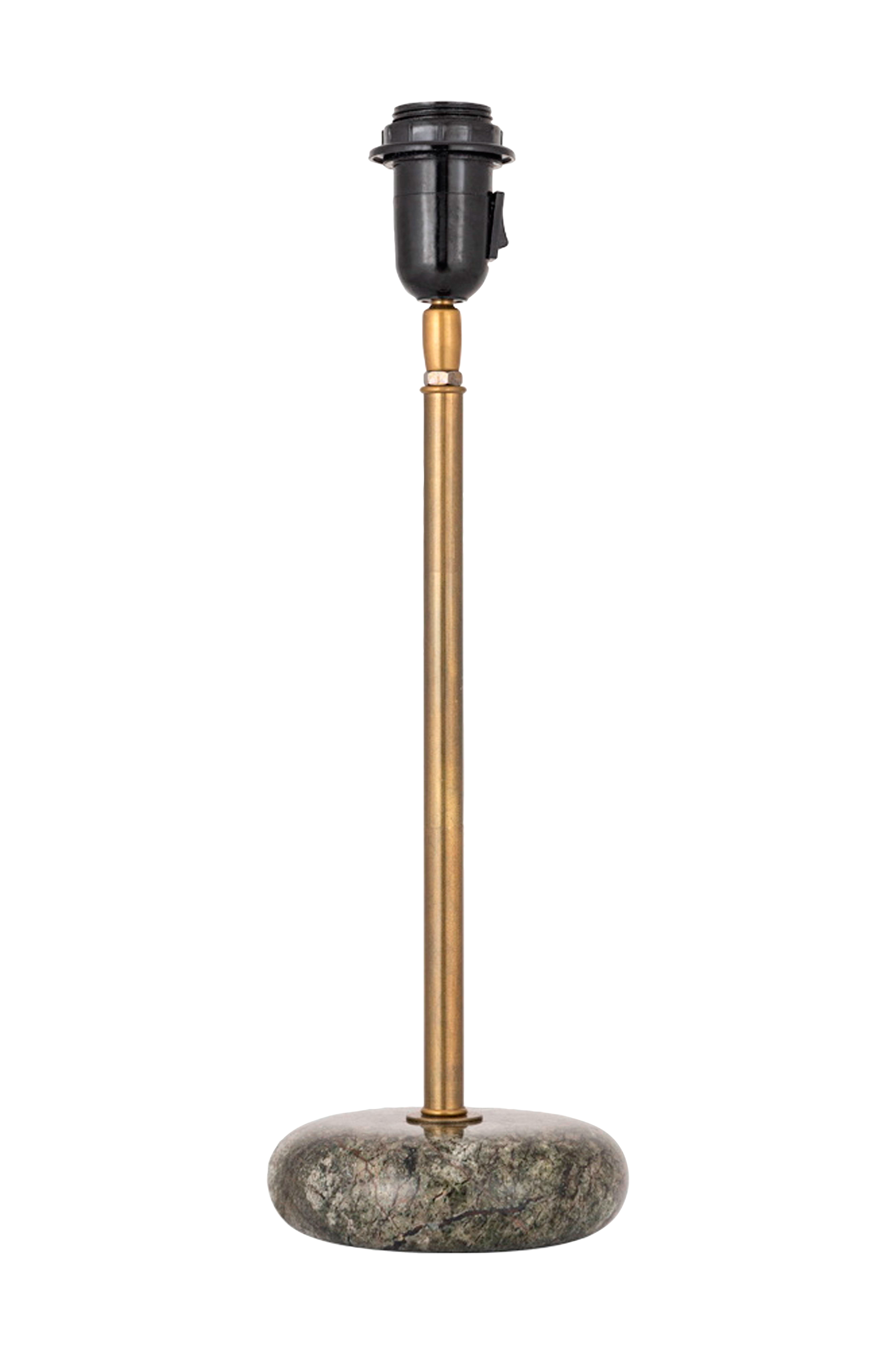 En vacker bordslampa. Basen har en mjuk, rundad form. En robust och stabil lampfot med detaljer i antikfärgad mässing. Materialet är naturligt och varje lampa är unik, stenens färg varierar från exemplar till exemplar. Praktisk med en strömbrytare på lamphållaren.