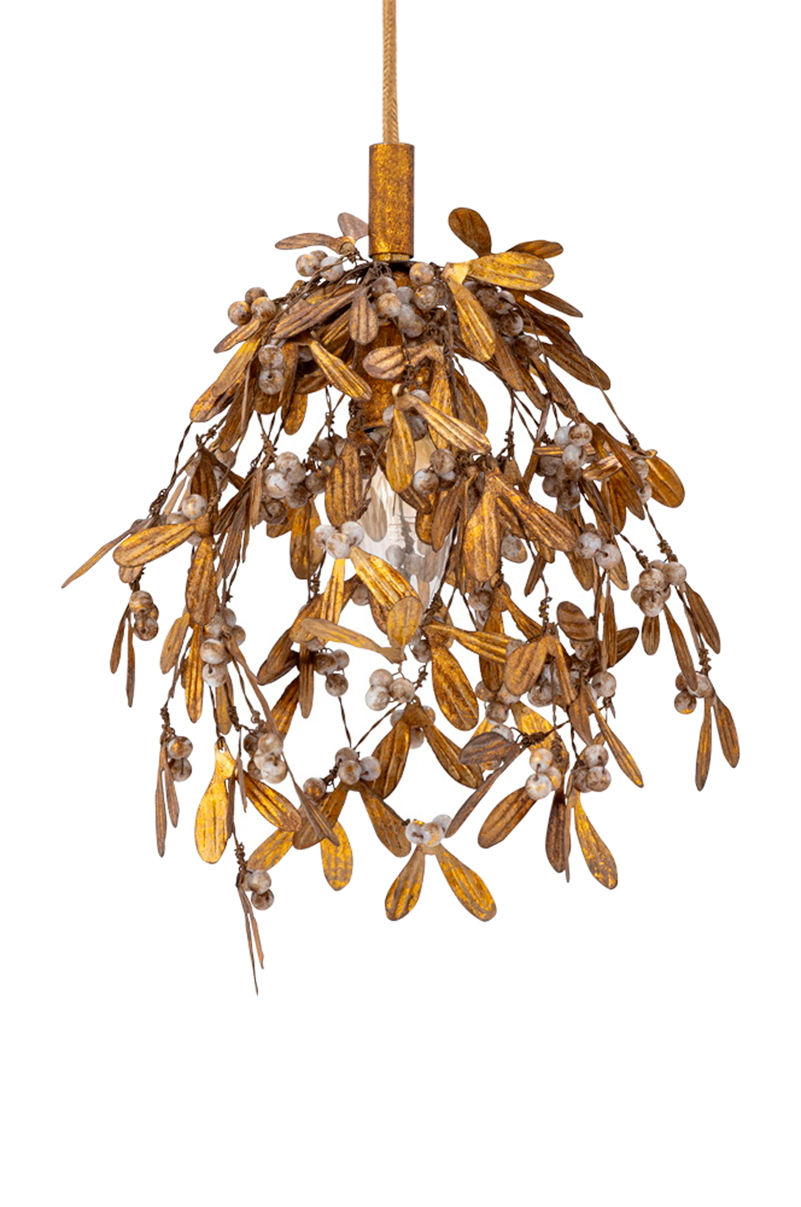Mistletoe är en hängande dekorativ lampa som passar i fönster eller varför inte i en dörrkarm! Tillverkad av metall. Varje litet blad är präglat och har sedan fått en antikfärgad ytfinish. Små vita pärlor är uppträdda på guldtråd i bladvecken. Med en 3,5 m lång kabel är denna lampa lätt att placera och hänga. Vi rekommenderar en klar guldfärgad ljuskälla.