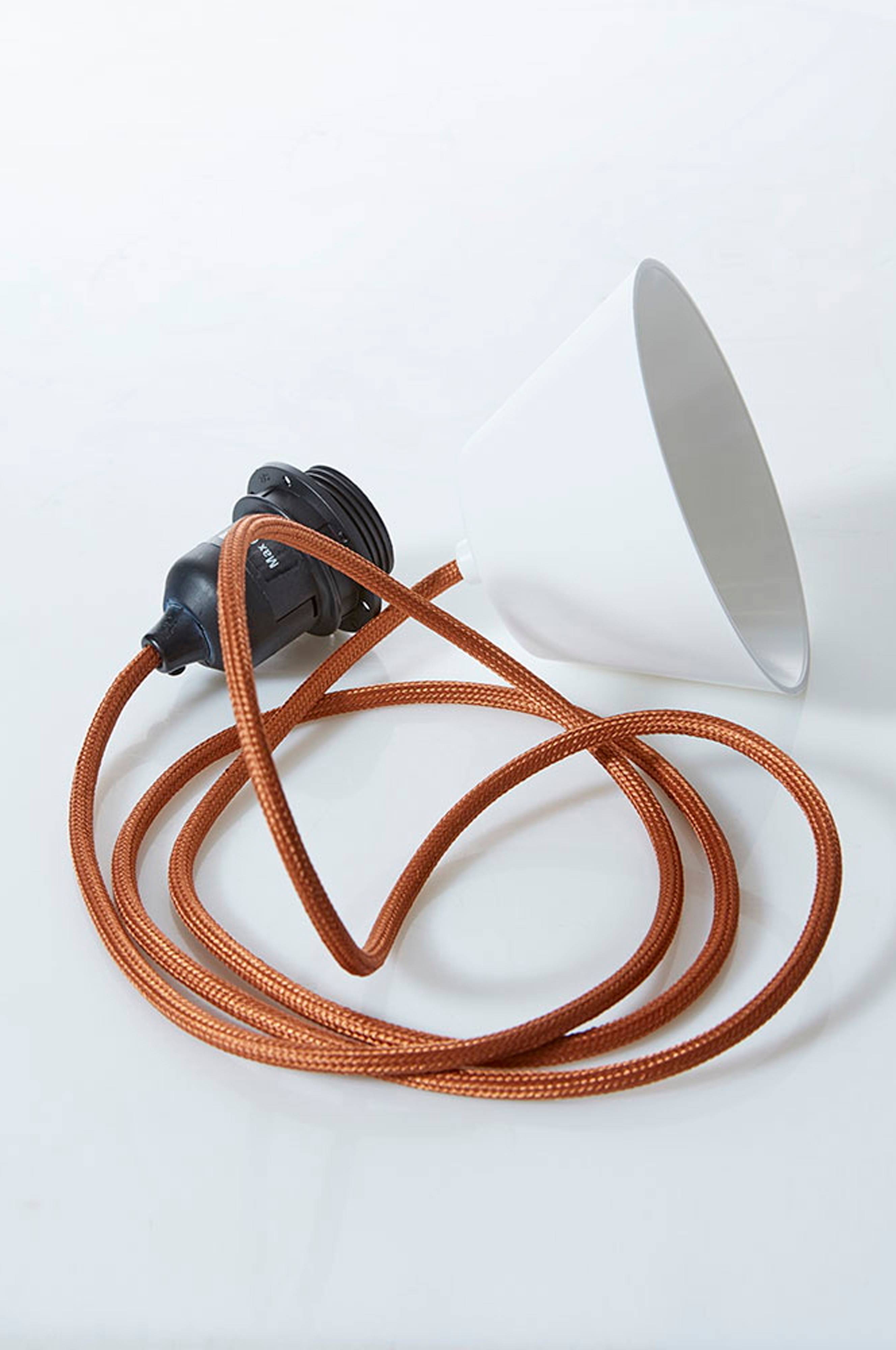 En takupphängning med textilklädd sladd, utformad för att passa våra taklampskärmar med e27-fäste.