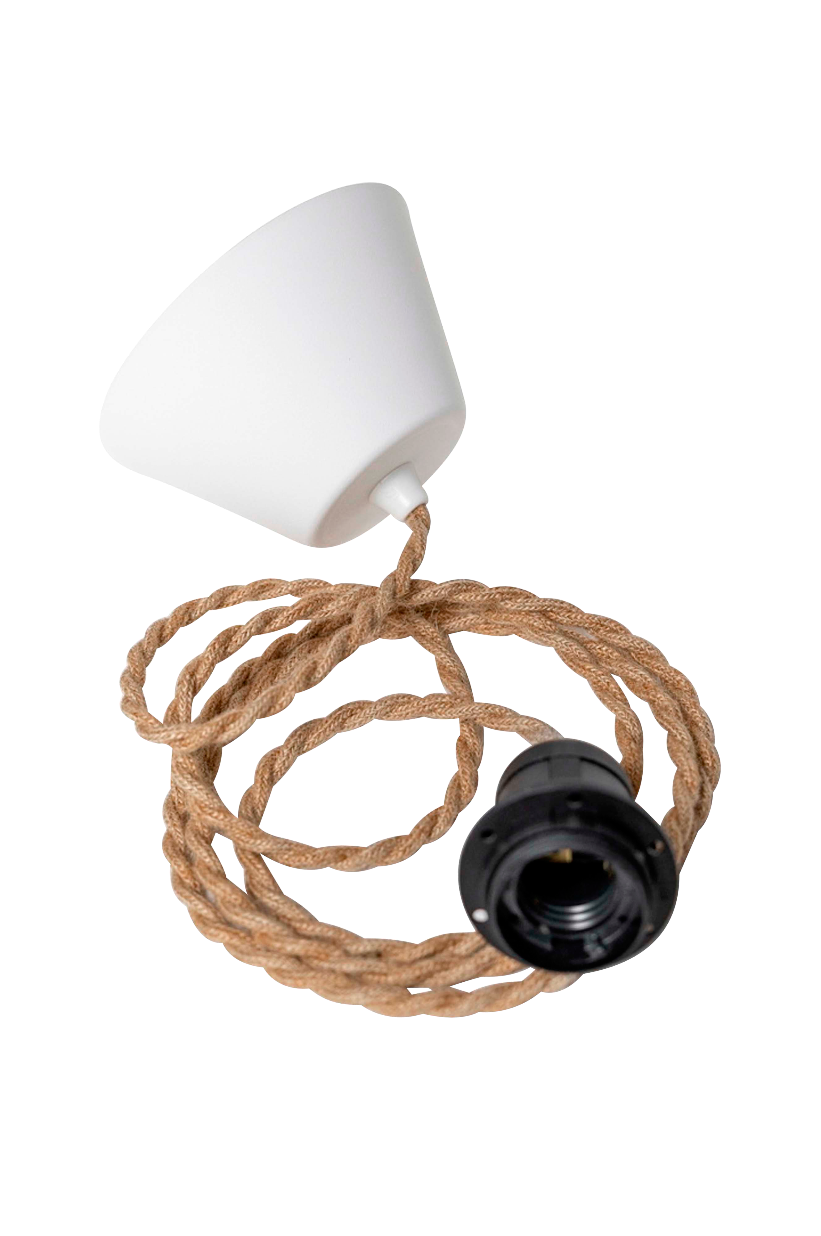 En takupphängning med textilklädd sladd, utformad för att passa våra taklampskärmar med E27-fattning.