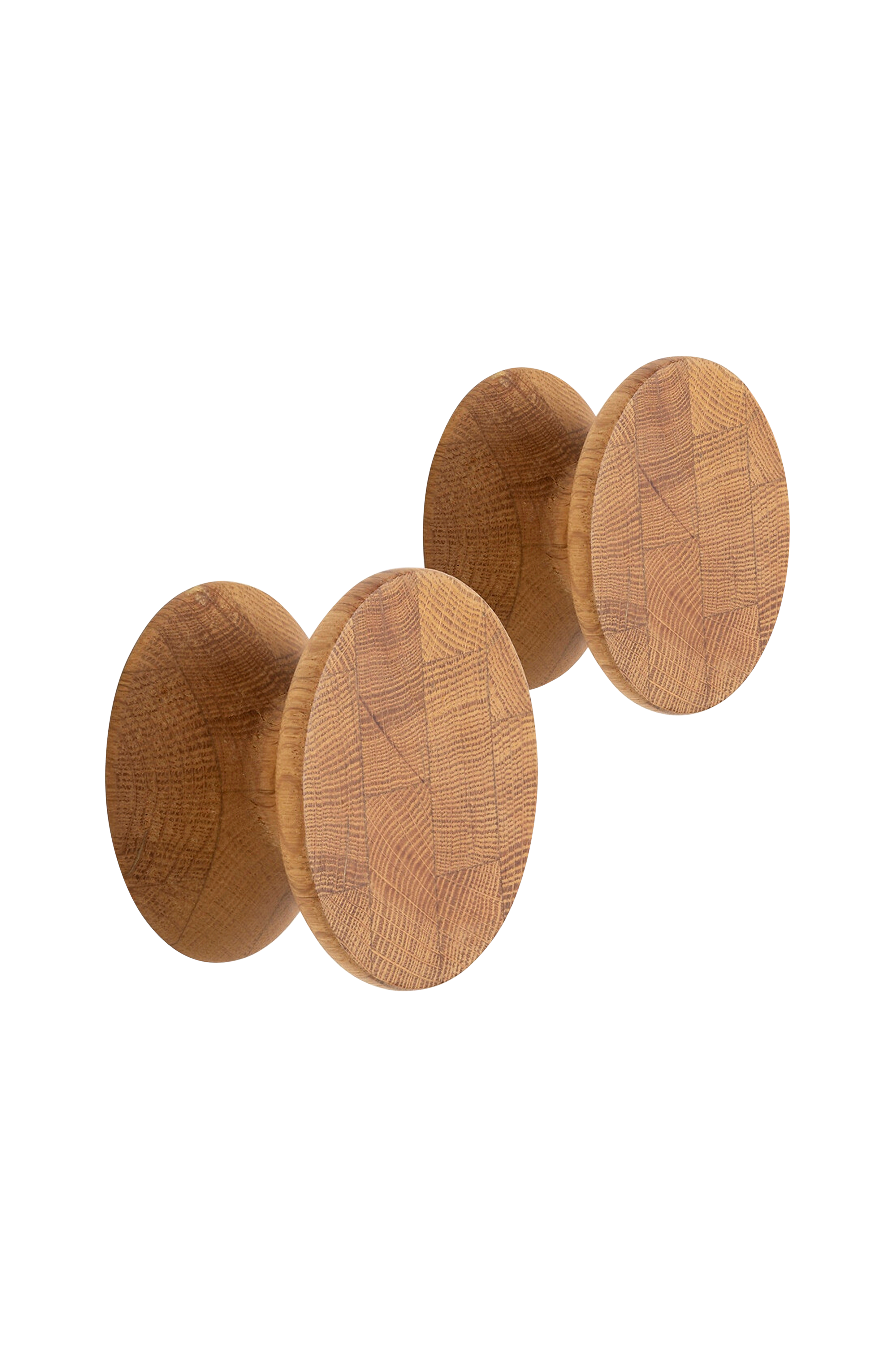 De två vägghängarna Arame är tillverkade av massiv ek FSC® från ansvarsfulla skogsbruk och har en design inspirerad av diaboler. De har 2 olika diametrar vilket skapar en ackumulerande effekt.