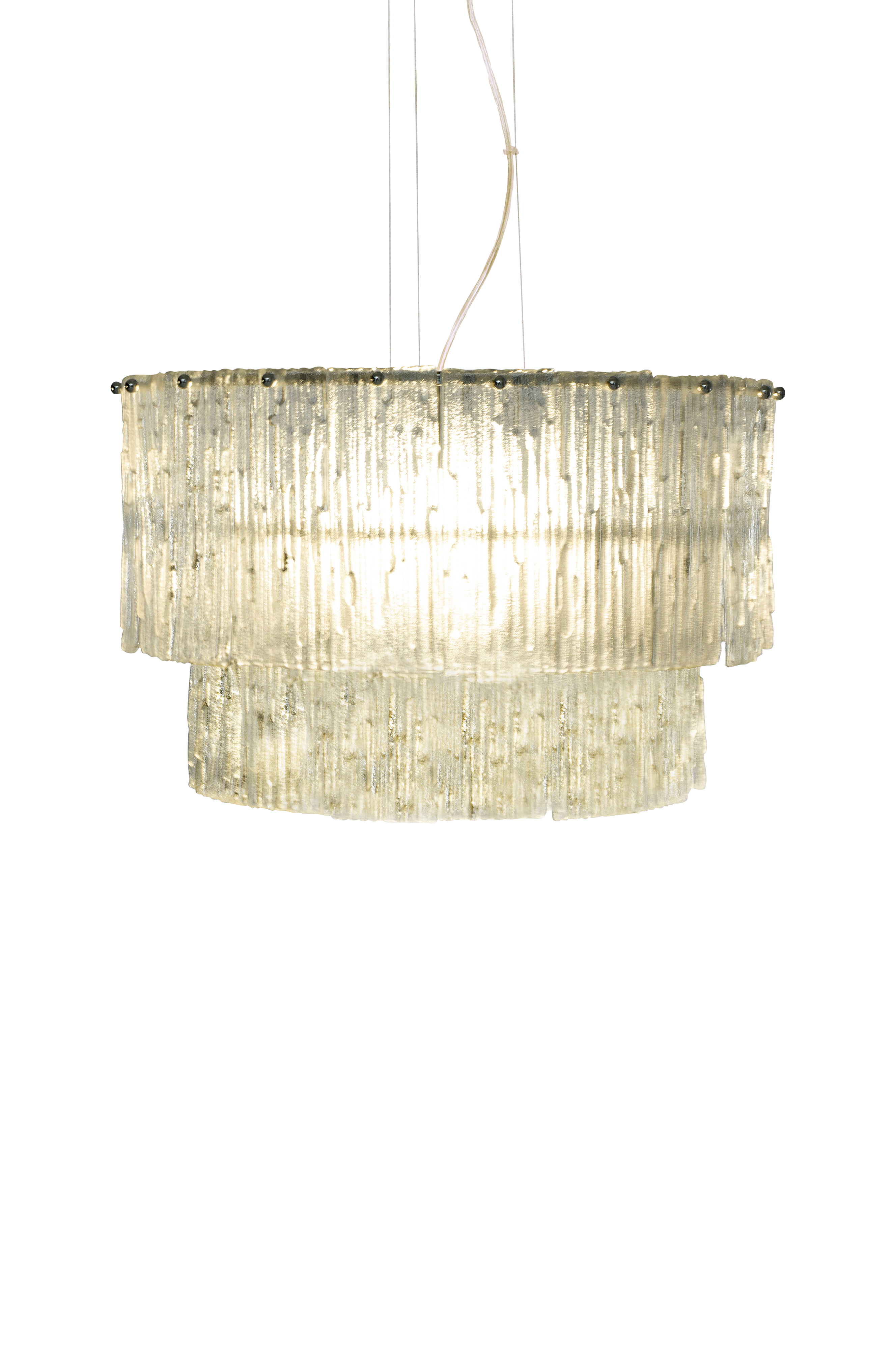 Den vackra abelone-takpendeln i retroinspirerad stil passar lika bra i ett klassiskt som i ett modernt hem. Den är tillverkad av metall och har glas med en isliknande struktur. Lampan låter ljuset passera både uppåt och nedåt, samtidigt som den sprider ett filtrerat, mjukare ljus åt sidorna. Abelone takpendel kan vara en ögonfallande inredningsarmatur ovanför middagsbordet eller en bra allmän belysning i vardagsrummet.