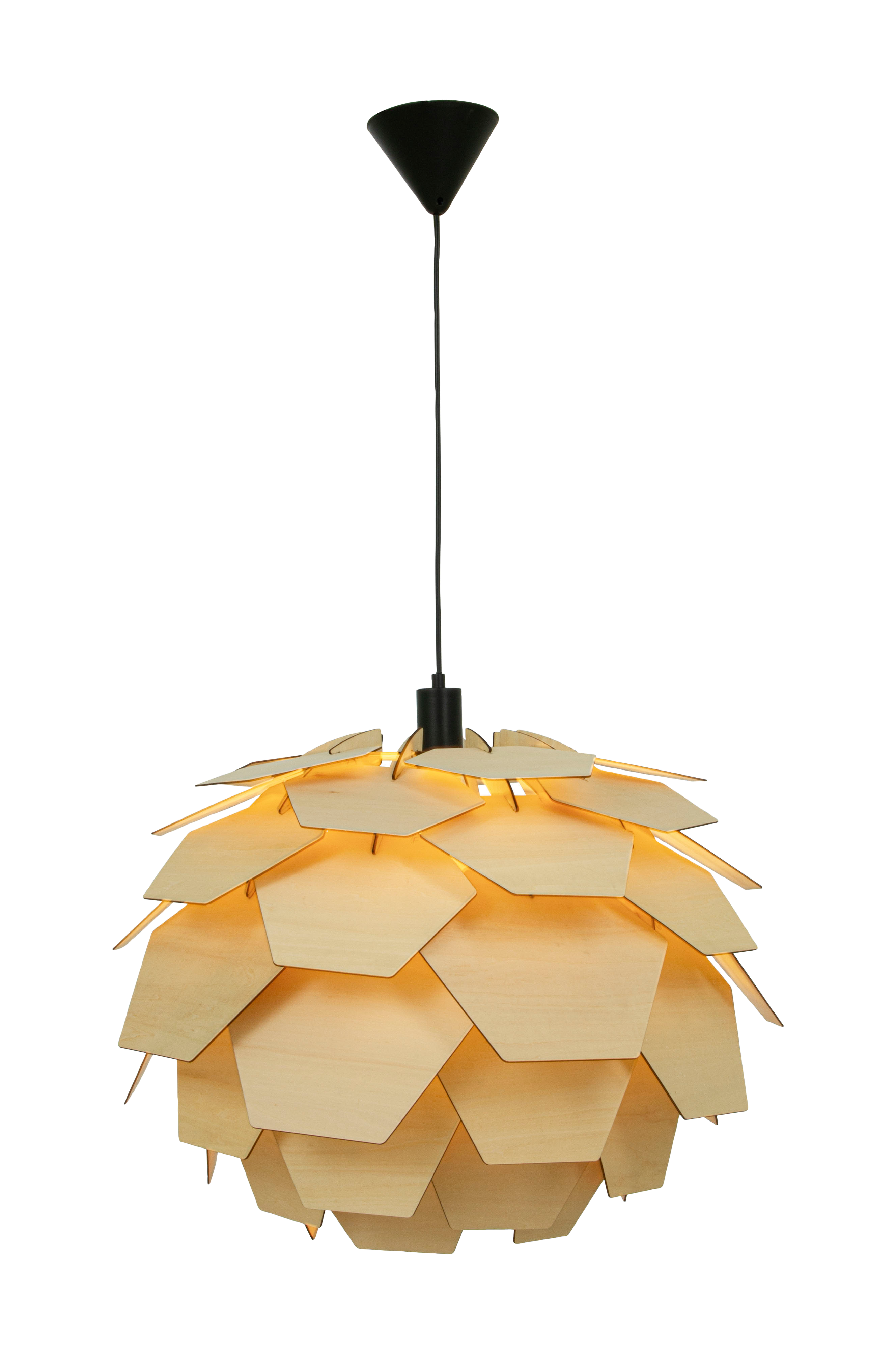 Vackra Carpatica taklampa, med flera lager av trälameller med brunbetsad faner, har en design som påminner om en rund kotte. Lampan ger ett dämpat, väldigt trivsamt ljus som är perfekt i vardagsrummet eller över matbordet. Carpatica levereras i ett platt paket, du monterar själv ihop lampan i några enkla steg. Svart takkopp med krokupphäng. Lampan är justerbar i höjd där minsta totalhöjd är 60 cm och högsta är 280 cm.