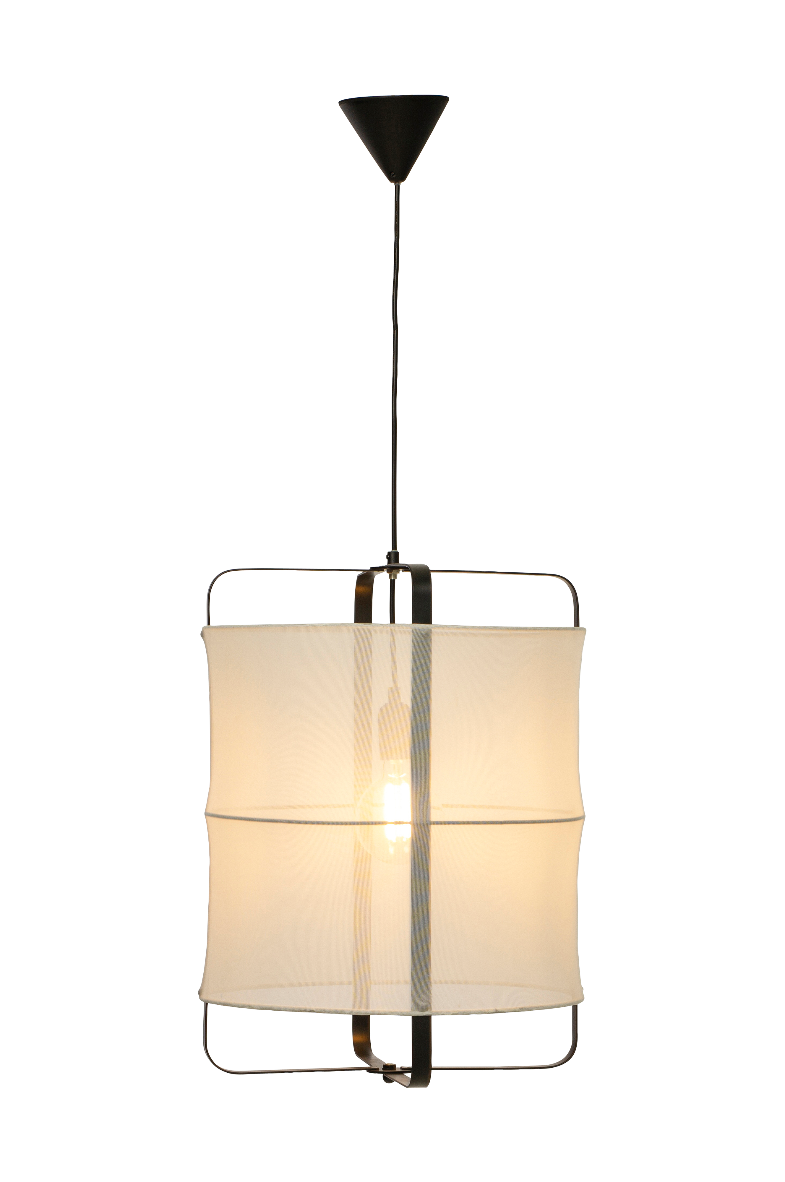 Taklampan rammi har en stilren design med en svart metallstomme omsluten av en skir textilskärm som sprider ett mjukt ljus i rummet. Med sin enkla och eleganta design passar rammi lika bra i vardagsrummet som över köksbordet.