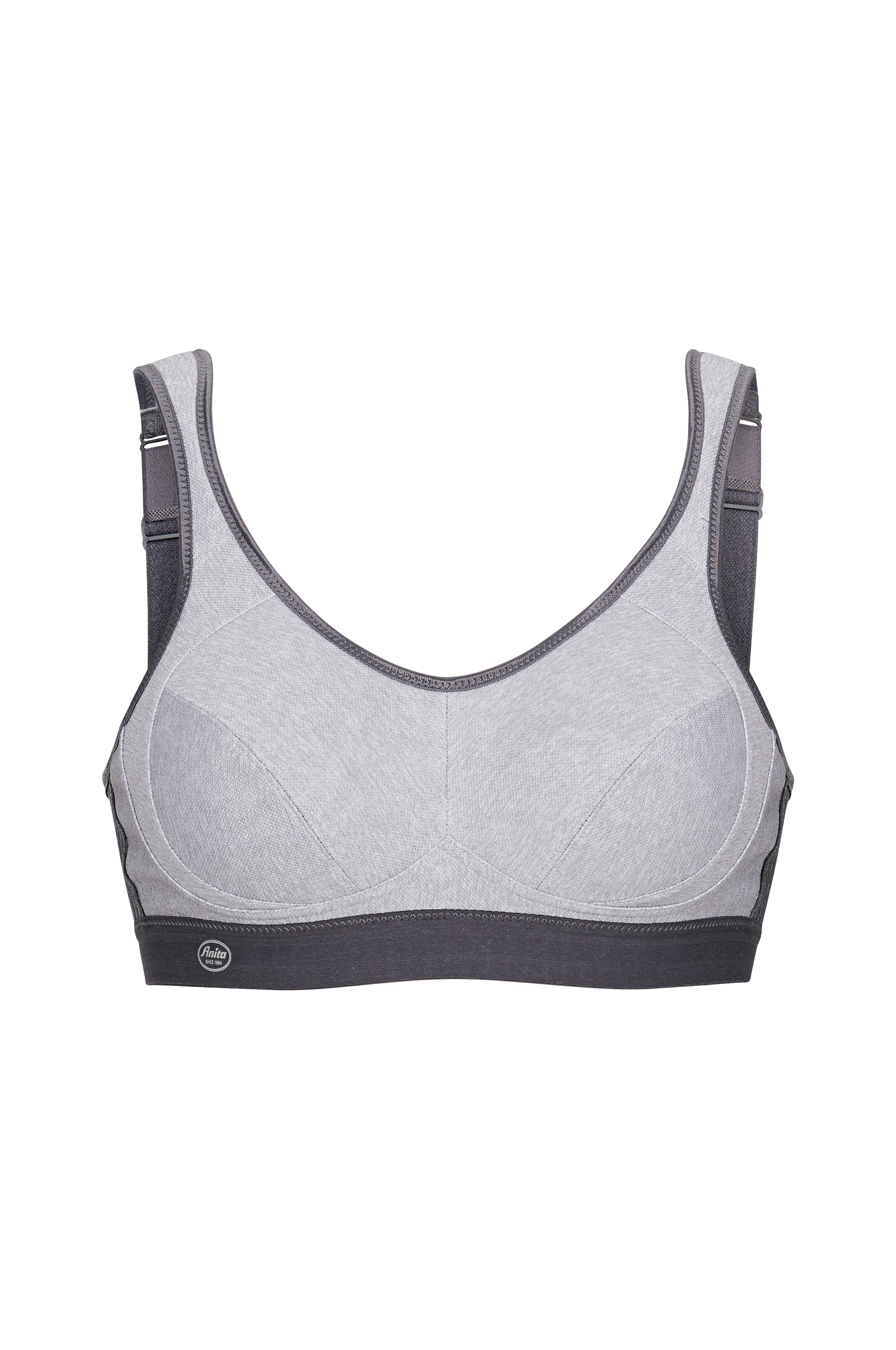 Protes-bh Sport från Anita är snyggt melerad, ljusgrå framtill med mörkgrå, elastiska kantband och mörkgrå baktill. Lätt vadderade axelband som är elastiska och justeras i längd bak. Tack vare den genomtänkta konstruktionen passar sport-modellen även för dig som genomgått någon form av bröstoperation. Fickor för bröstprotes.