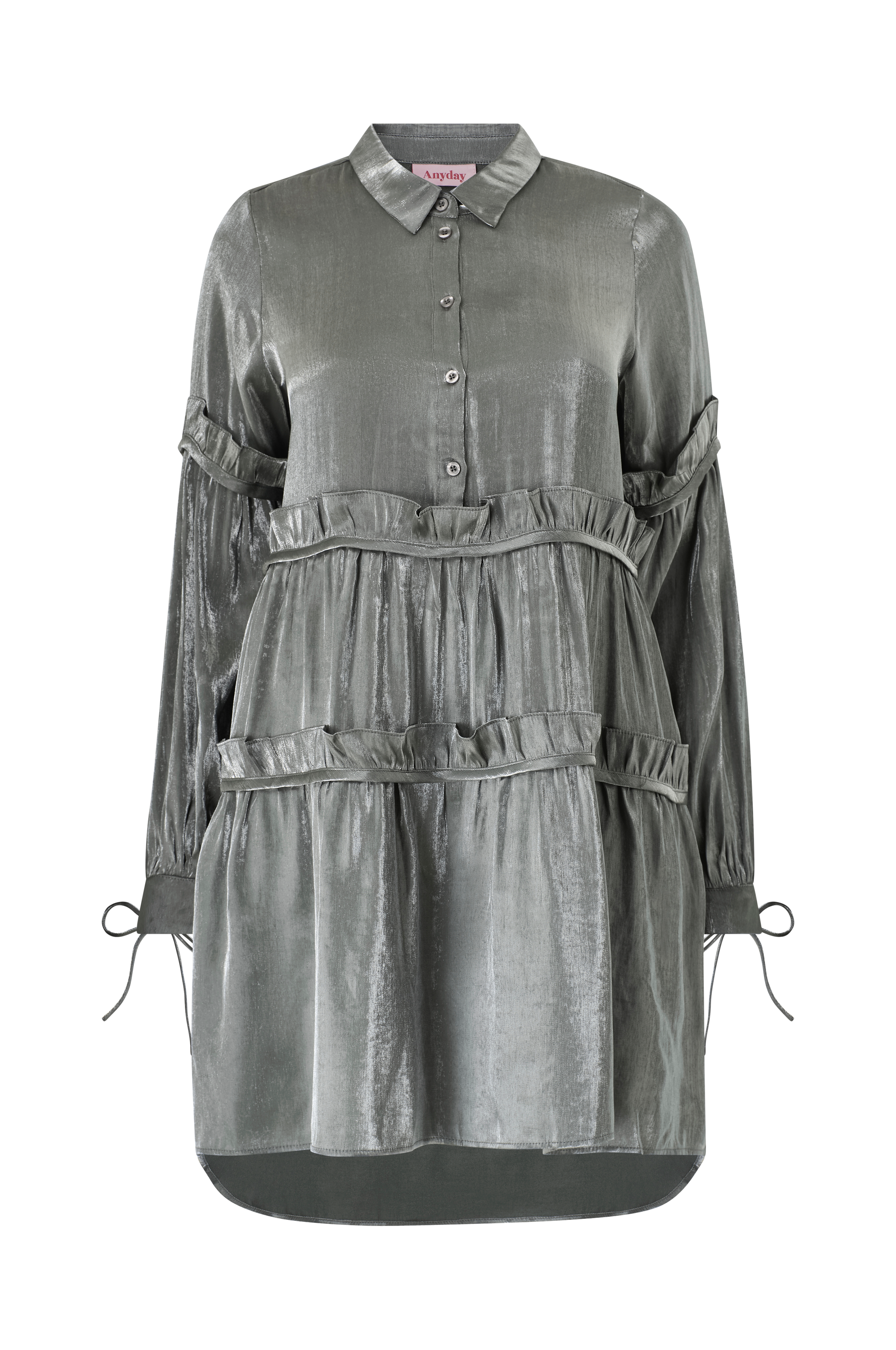 • Skimrande klänning i viskosmix • Klassisk skjortkrage • Kort knäppning upptill • Långa ärmar med volangkant upptill • Ärmslut med volang och knytband • Volanger nedtill • Utsvängd modell • Något längre baksida • Längd: 109 cm i storlek 42/44 • Plusstorlekar