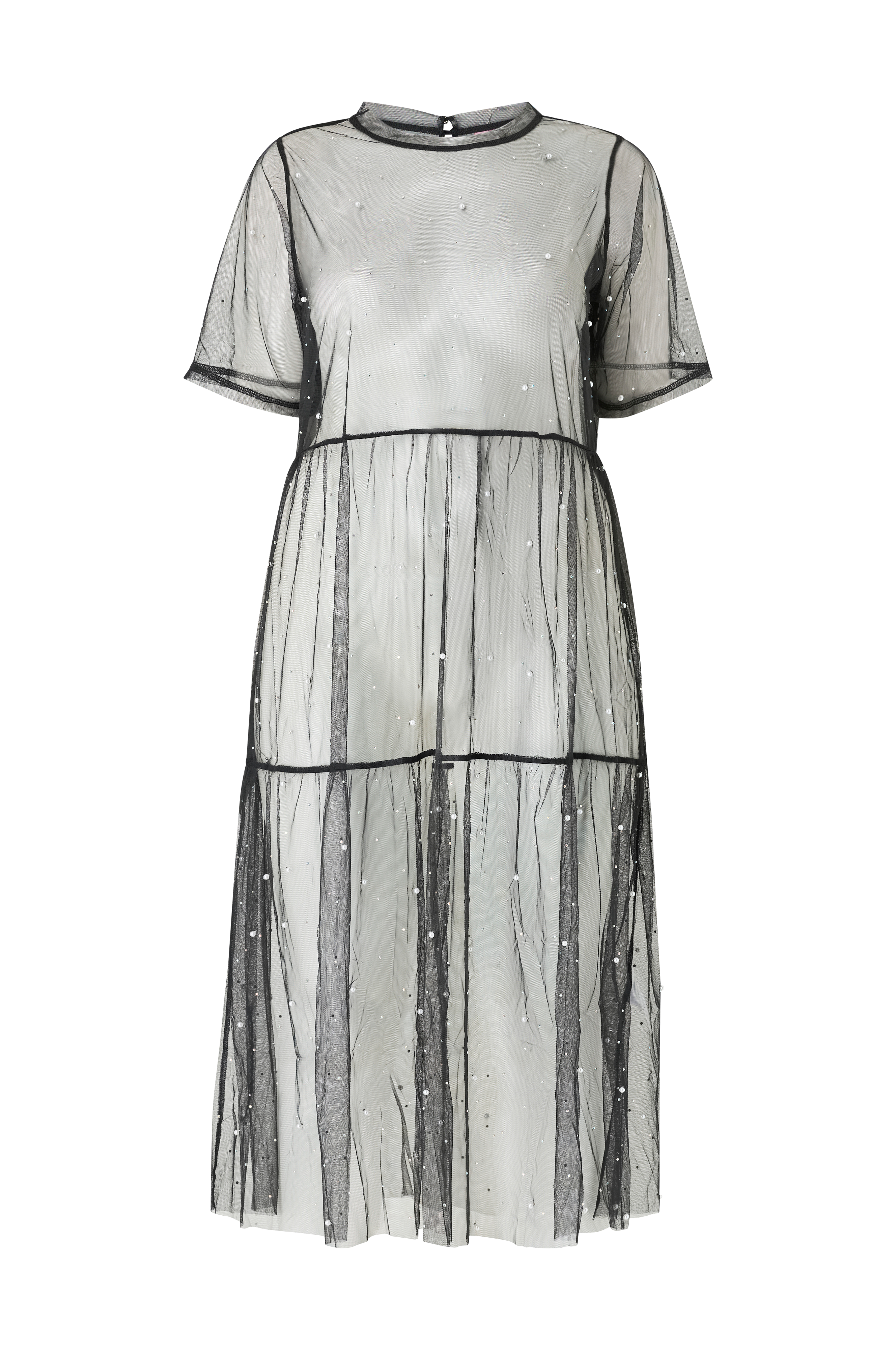 • Transparent, ofodrad klänning i mesh• Rund halsringning• Sprund med knapp i nacken• Volang nedtill• Utsvängd kjol• Dekorativa pärlor och strasstenar över hela• Längd: 129 cm i storlek 42/44• Plusstorlekar
