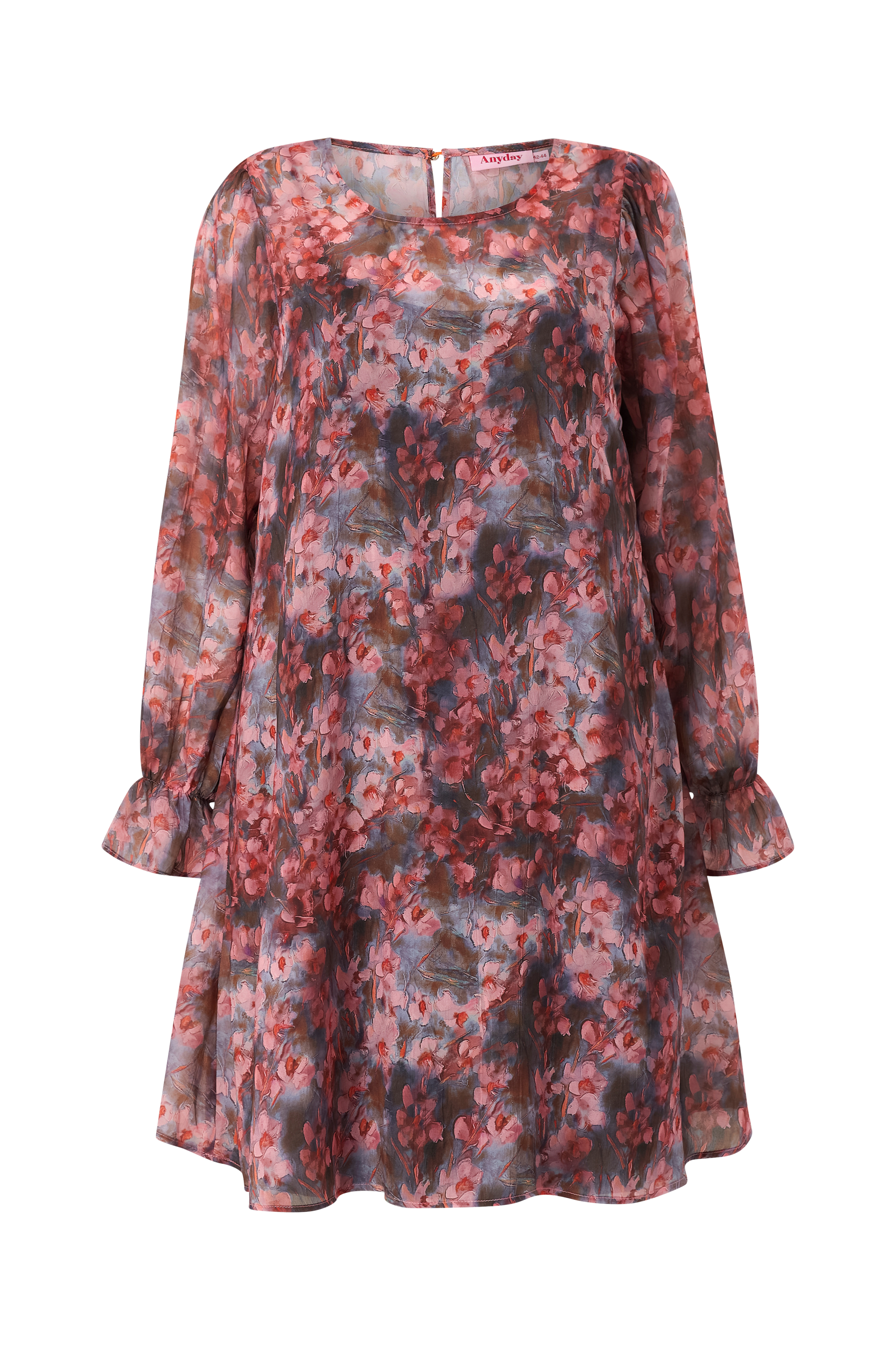 • Tunn, blommönstrad klänning i chiffong• Rund halsringning med sprund och knapp i nacken• Långa ballongärmar med resår och volang i ärmsluten• Fodrad• Längd: 103 cm i storlek 42/44• Plusstorlekar