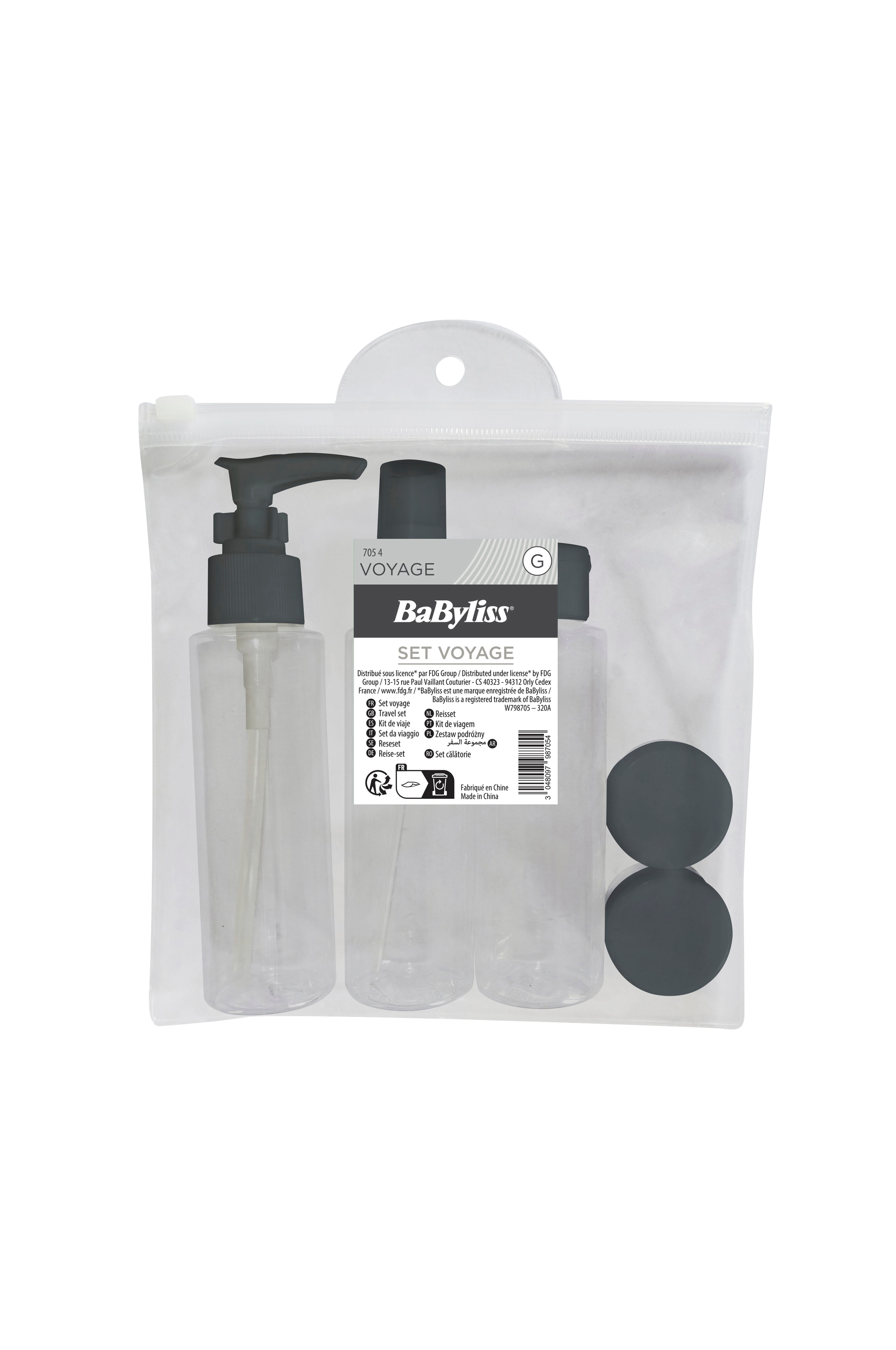 Travelkit som består av en transparent necessär, en sprayflaska 100 ml, en pumpflaska 100 ml, en flaska med lock 100 ml och två små burkar. Flaskorna är transparenta med grå lock.