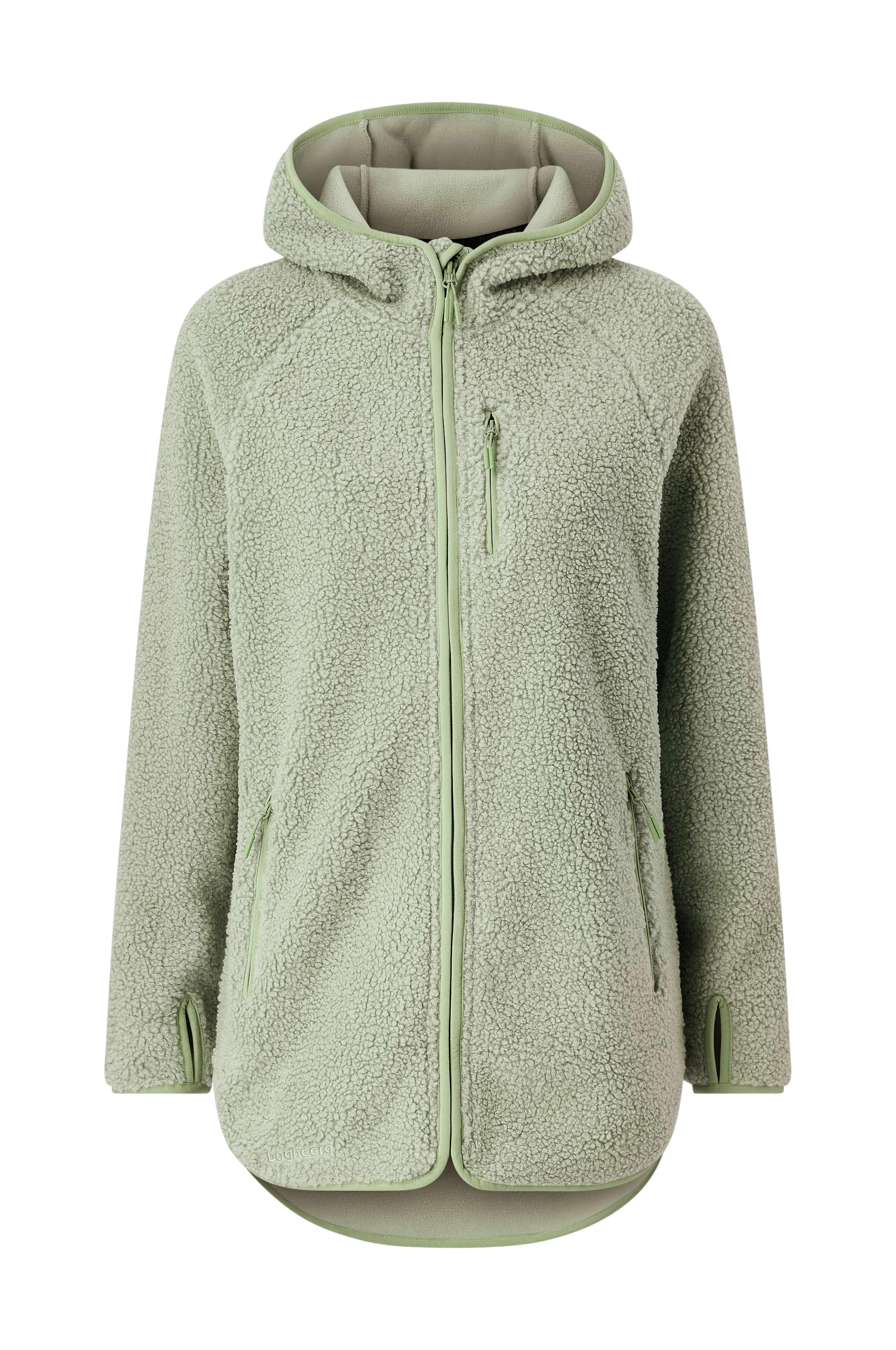 • Mjuk jacka i pile • Värmande innerfoder i fleece • Huva med resårkant • Långa ärmar med resårkant med ett tumhål i ärmsluten • Dragkedja fram • En bröstficka med dragkedja • Två handfickor med dragkedja • Rundad nederkant med något längre bakstycke • Längd: 81 cm i storlek XS