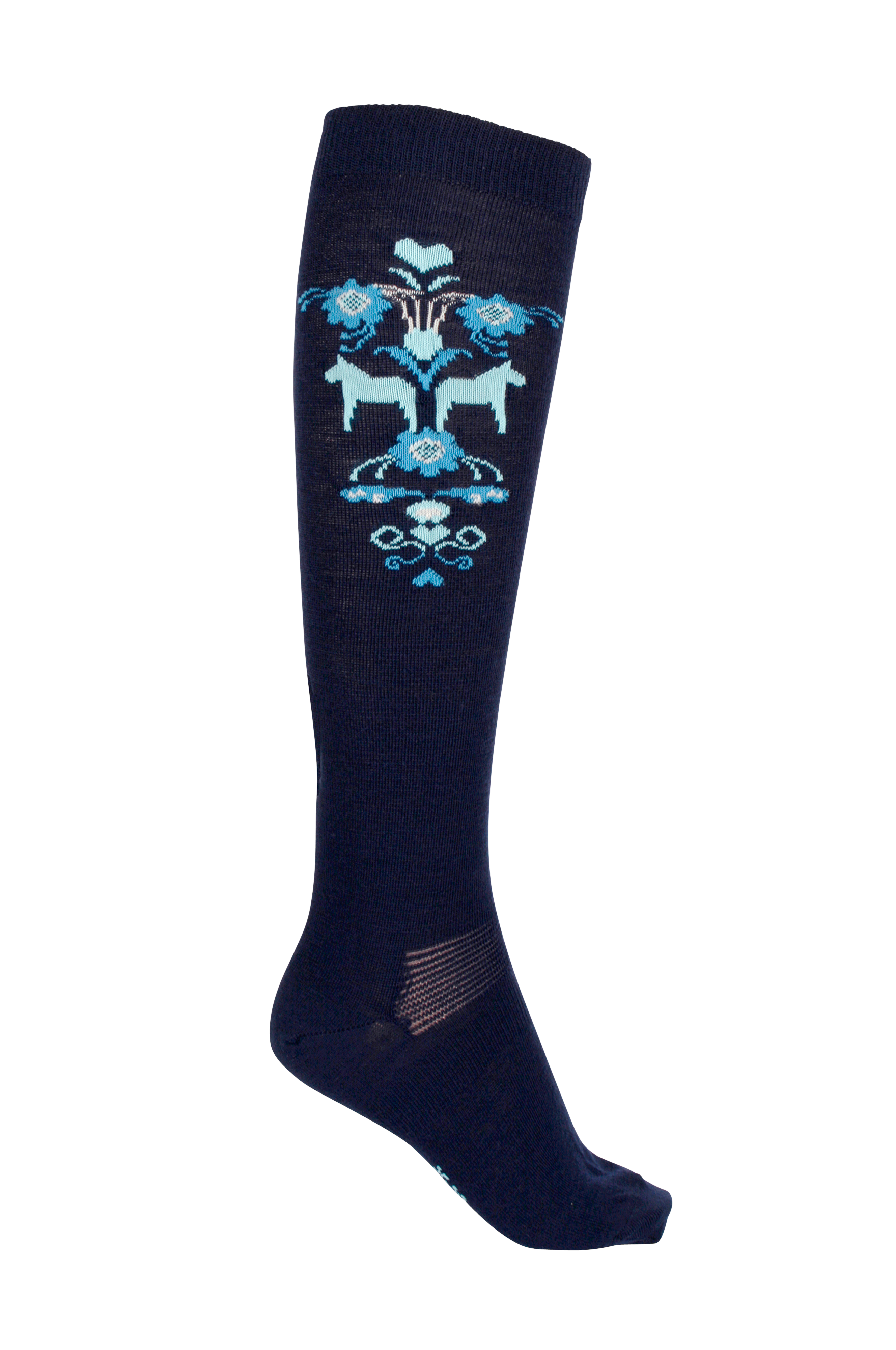Strumpor Merino Dalecarlian Socks High från Bagheera. Knähöga strumpor i merinoull med fin kurbits på skaftet. Elastisk i ankel och hålfot för bästa passform.