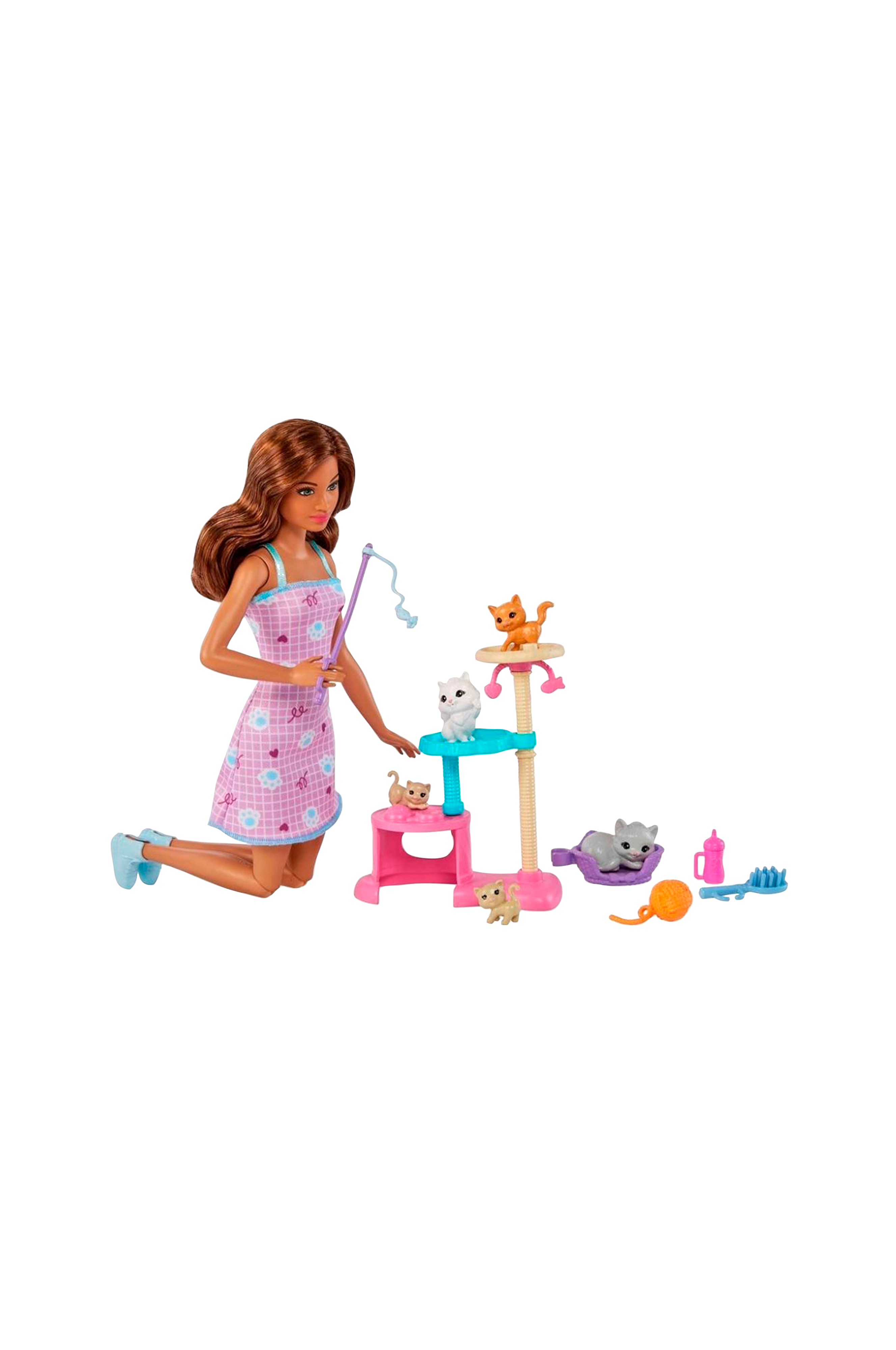 Barn kan hjälpa barbie® att ta hand om kattungarna med tillbehör som uppmuntrar till rolig lek som en flaska, borste och en garnboll.