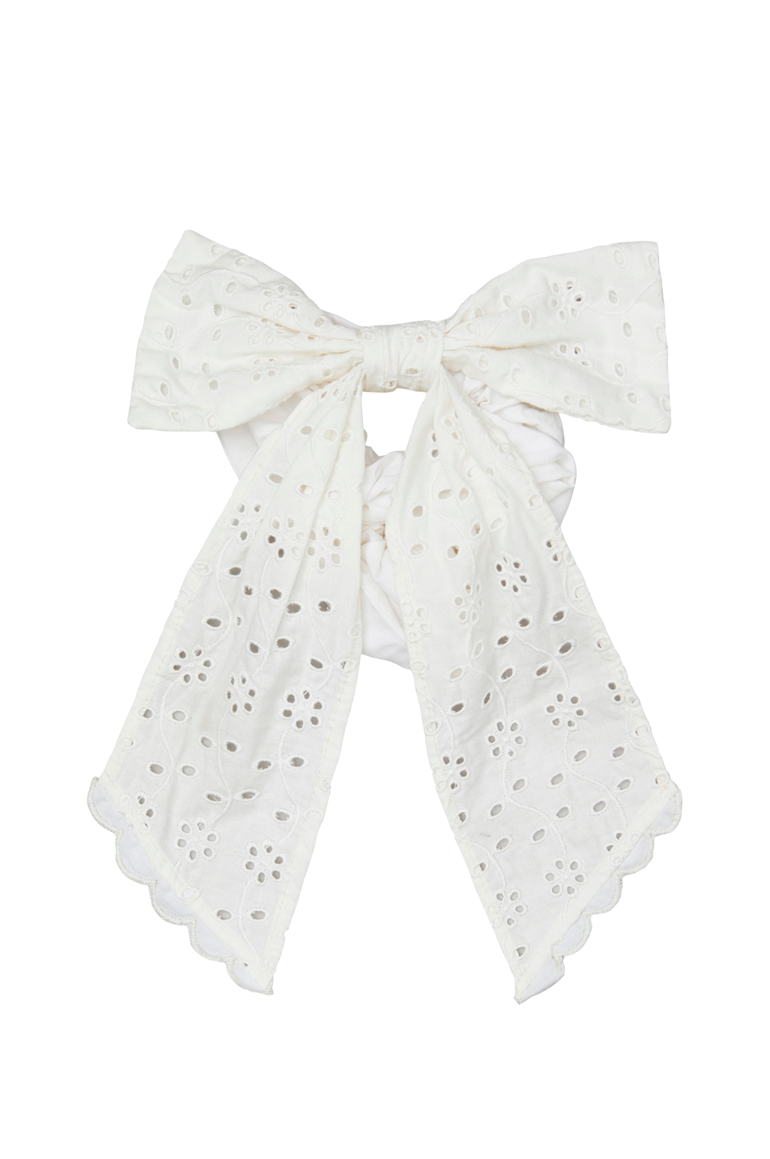 • Hårband i textil med stor rosett med broderat hålmönster
