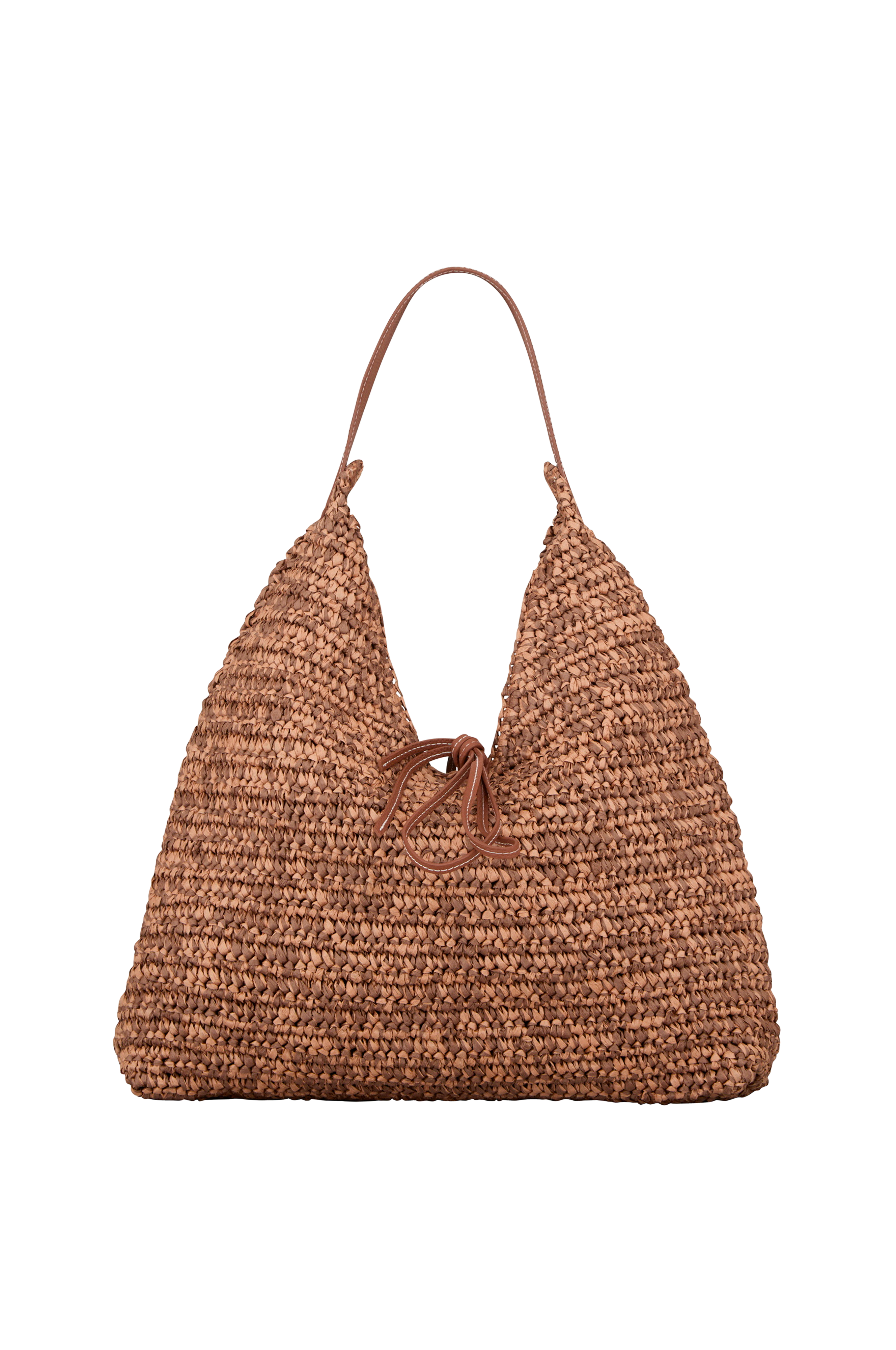 • Väska i pappersstrå• En axelrem• Detaljer i läder• Huvudfack med knytstängning• Ett invändigt dragkedjefack• Textilfoder