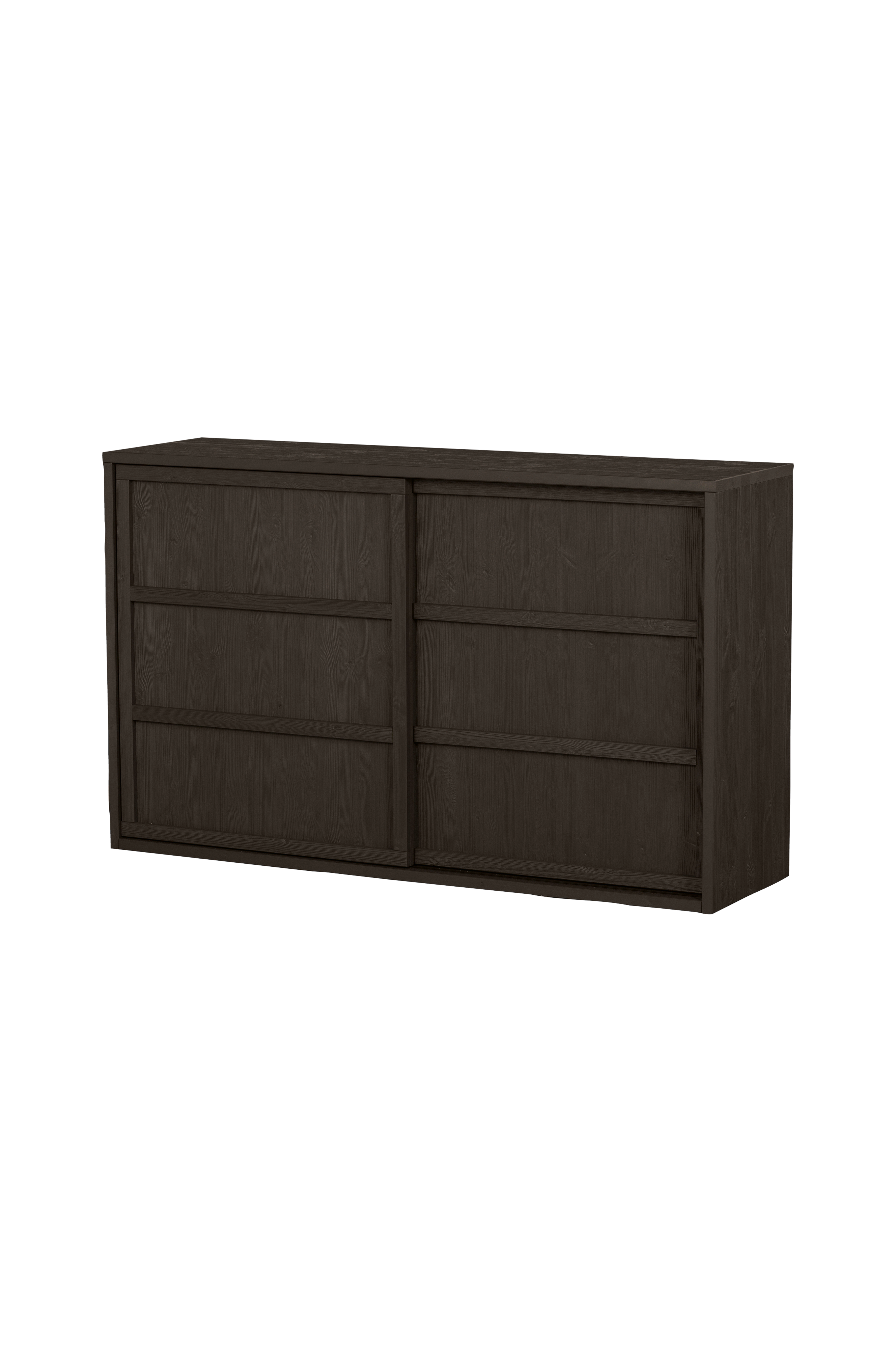 Produkten är tillverkad av djupborstad furu. Furumöblerna i våra kollektioner är FSC-certifierade och är behandlade på olika sätt. Slipad furu väldigt slät och jämn, medan borstad furu kännetecknas av ett karakteristiskt ådringsmönster och ett väderbitet utseende. För ett ännu mer robust utseende används bandsågad furu. Furu kännetecknas av en ljusgul färg och synliga flammiga märken. De svarta, dolda hyllplanen är tillverkade av spånskivor (FSC) och den svarta, bakre panelen är tillverkad av HDF (FSC).