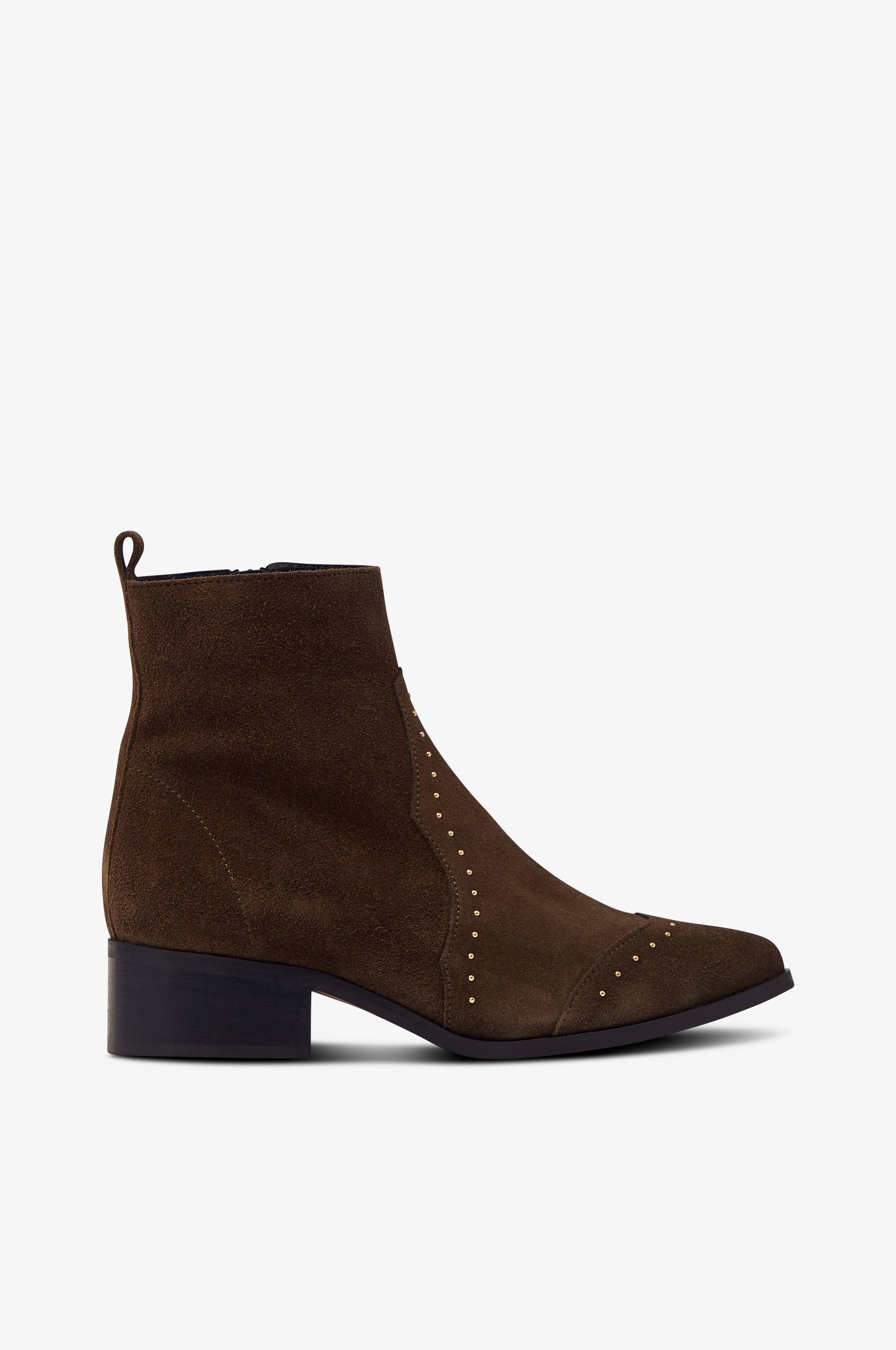 Boots biAdora Western Ankle Boot från Bianco i mjuk mocka med små, guldfärgade nitar. Western-inspirerad modell med spetsig tå och liten klack. Dragkedja på skaftets insida. Skafthöjd 13 cm, klackhöjd 4 cm.