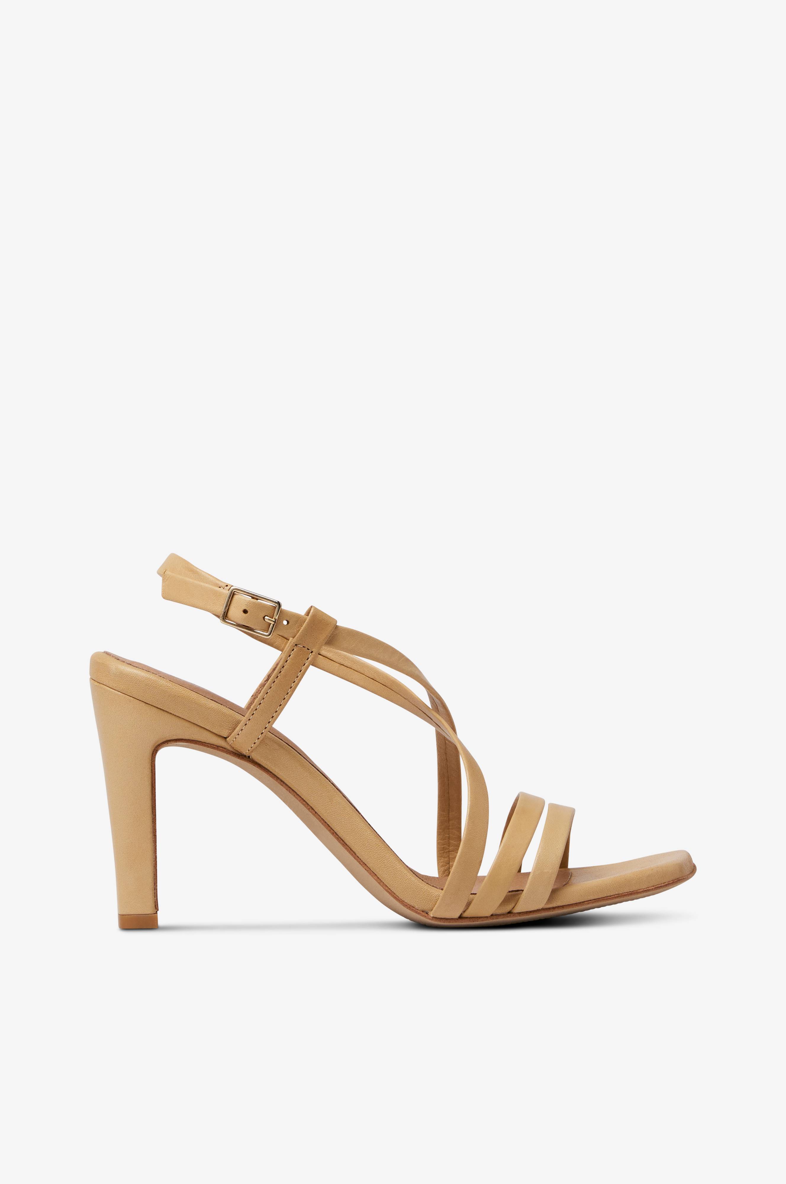 Sandalett med hög, klädd klack och remmar i skinn. Justerbar vristrem med spänne i elastisk infästning. Innersula i skinn.