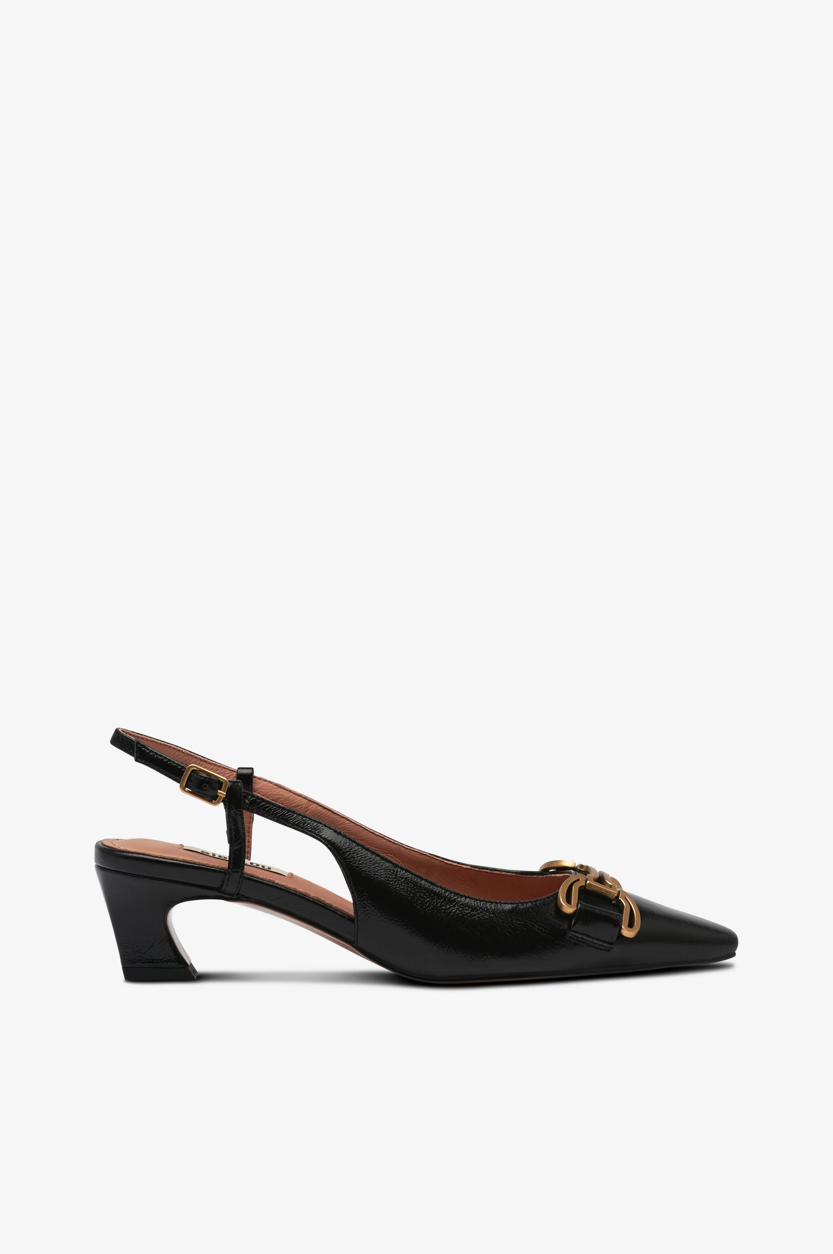 • Stilren modell i läder• Slingback med justerbar rem bak• Spetsig tå• Guldfärgat metallsmycke• Klackhöjd: 5 cm