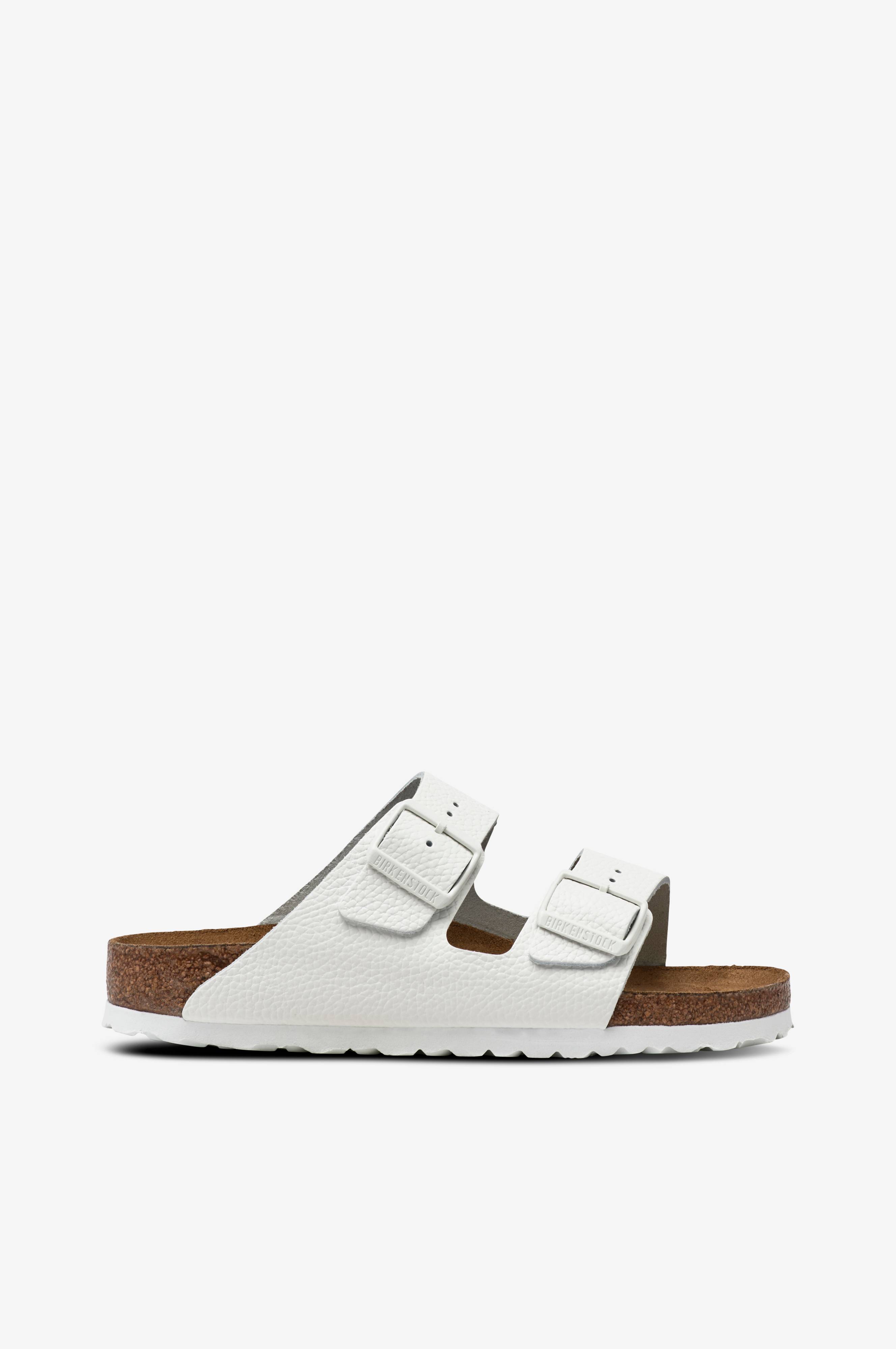 Bekväma, fotriktiga och stabila sandaler i skinn. Två remmar över vristen regleras med spännen. Mockaklädd fotbädd i naturkork. Yttersula i EVA. Denna modell har smal läst.