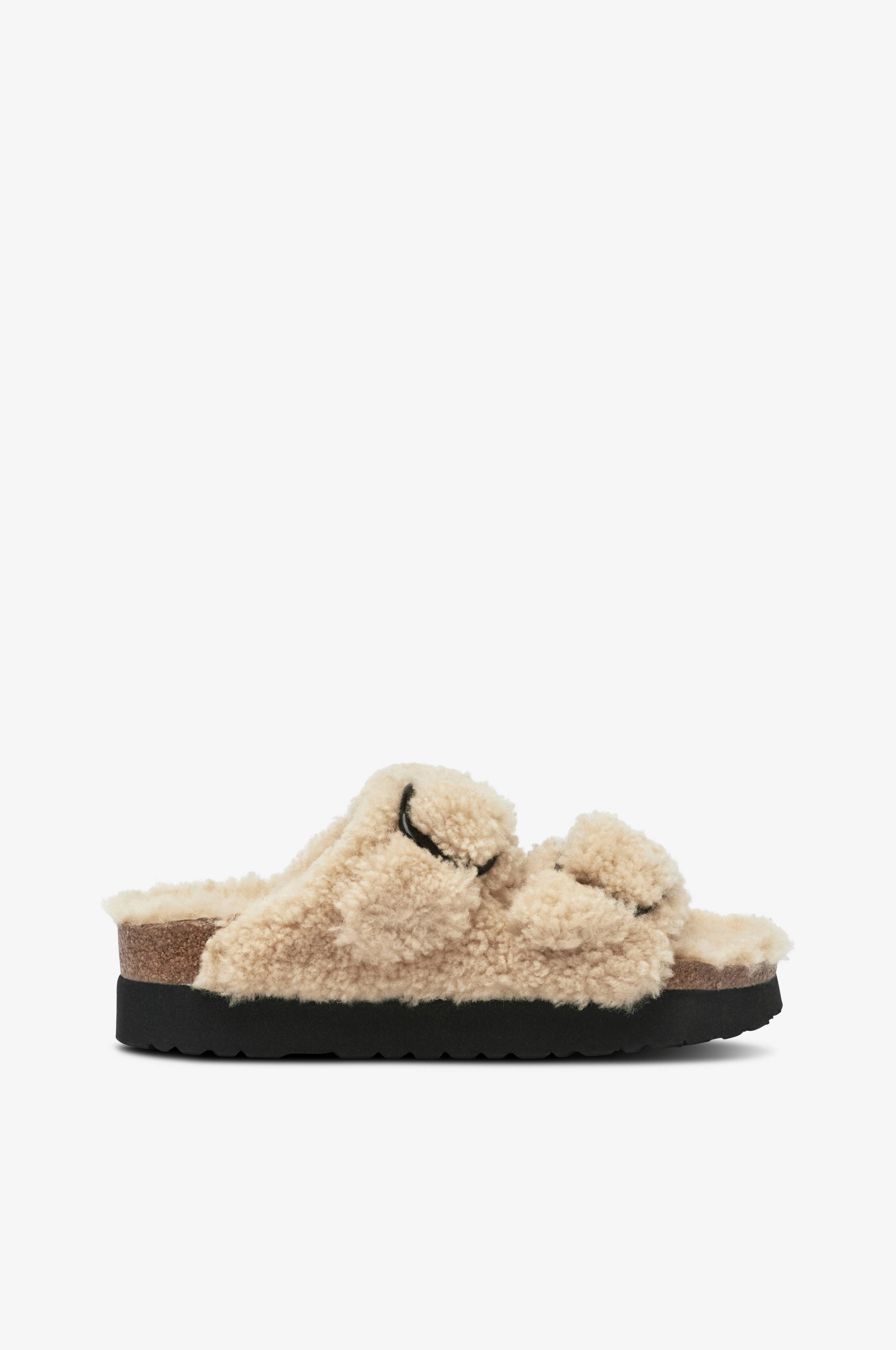 • Tofflor i fårpäls• Två justerbara remmar över foten• Foder i fårpäls• Anatomisk fotbädd i kork• EVA-yttersula