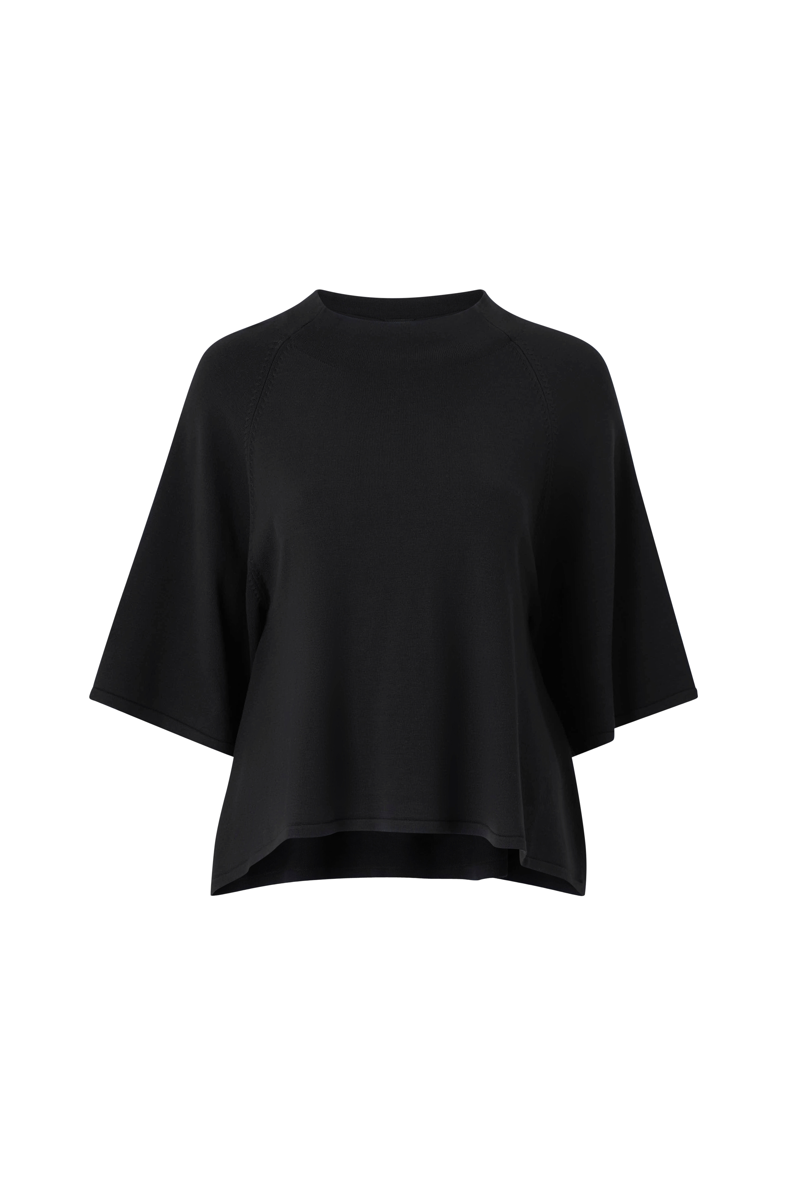 • Finstickad blus i mjuk viskosmix• 3/4-långa, vida ärmar med nerhasade axlar• Rundad halsringning med ribbstickning• Slitsar nedtill i sidorna• Plagget är något längre bak än fram