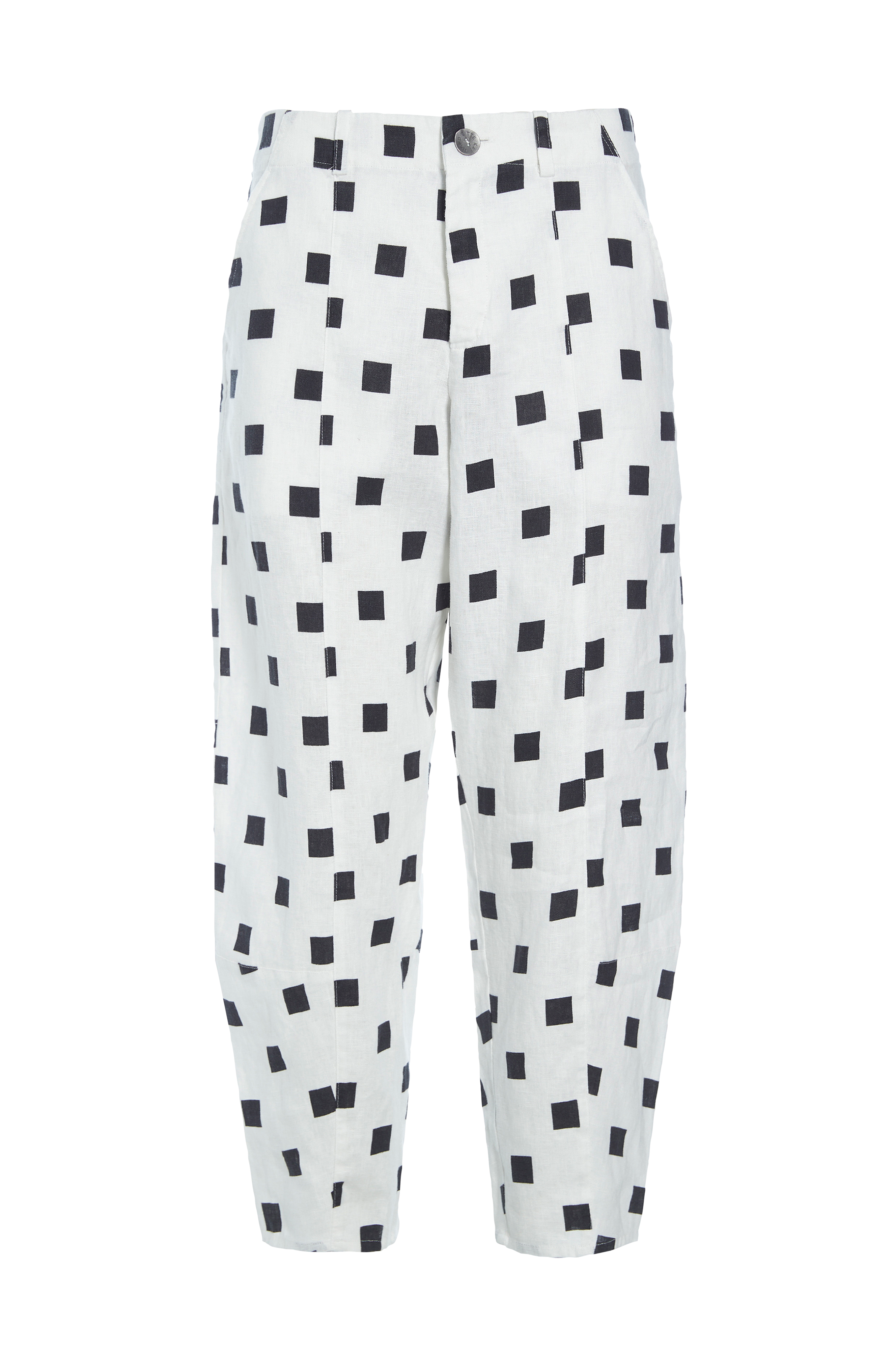 • Byxor i lyxig linnekvalitet• Grafiska rutor• Avsmalnande ben nedtill vilket ger en något säckig form• Bälteshällor• Knappstängning och gylf med dragkedja• Snedställda fickor fram