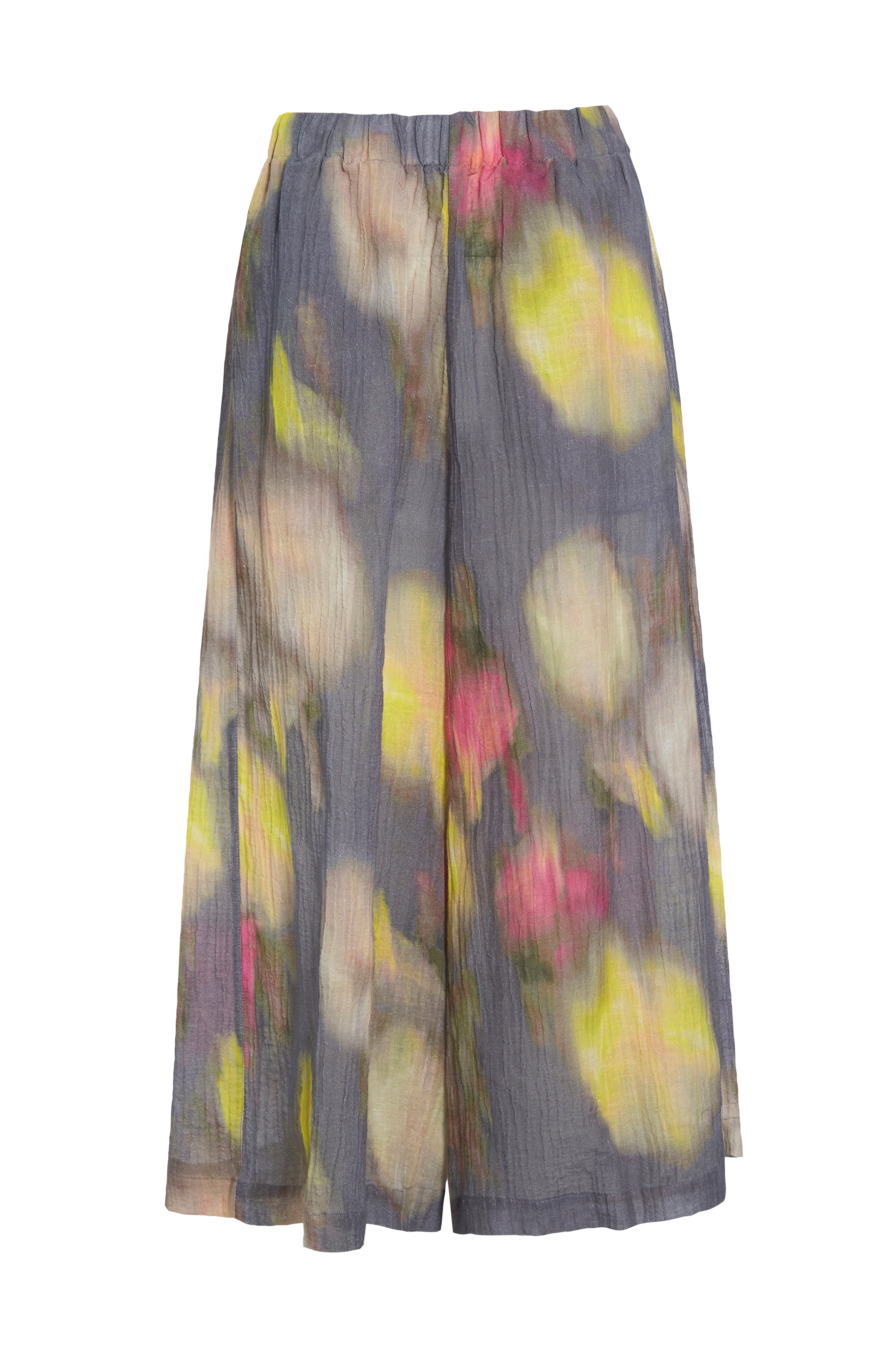 Byxor med vida, vadlånga ben och ett abstrakt mönster.