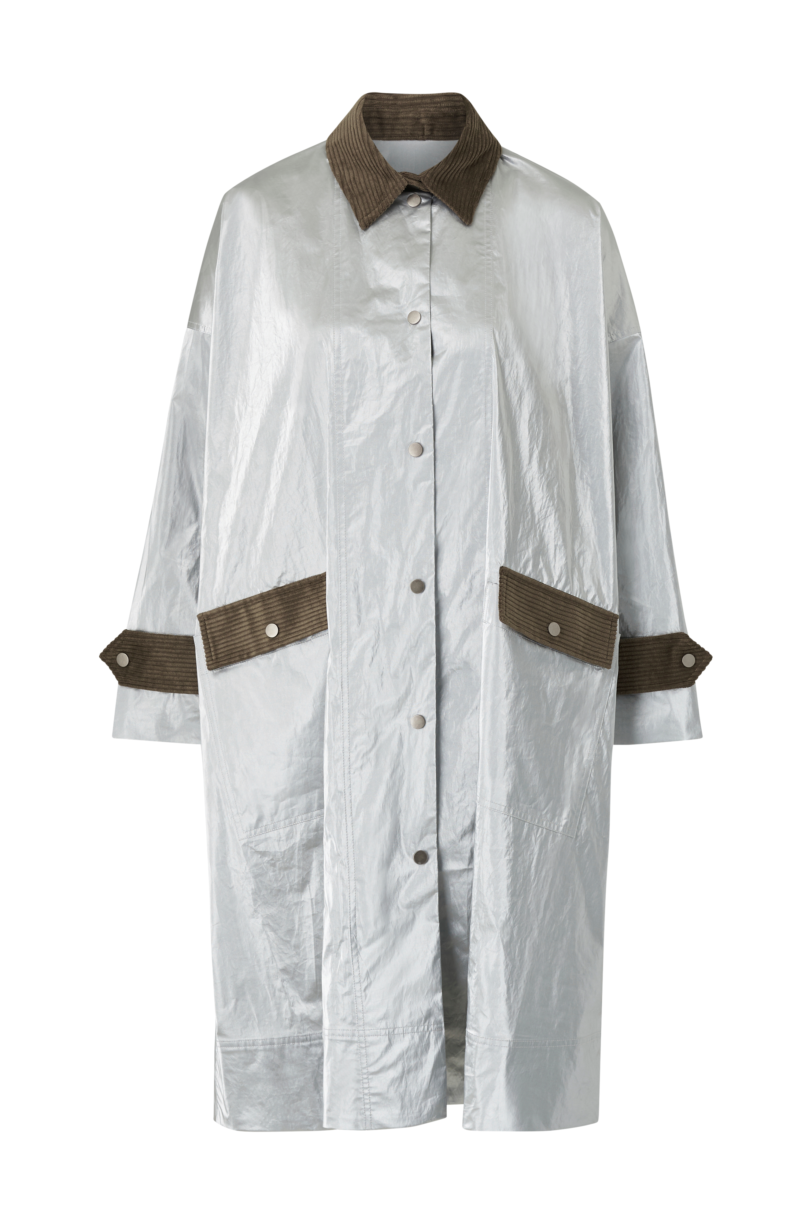 • Vid, utsvängd, silvrig modell med detaljer i manchester• Tryckknappar hela vägen fram• Lång, vid ärm• Stora fickor med ficklock• Längd: 108 cm i storlek 34/38