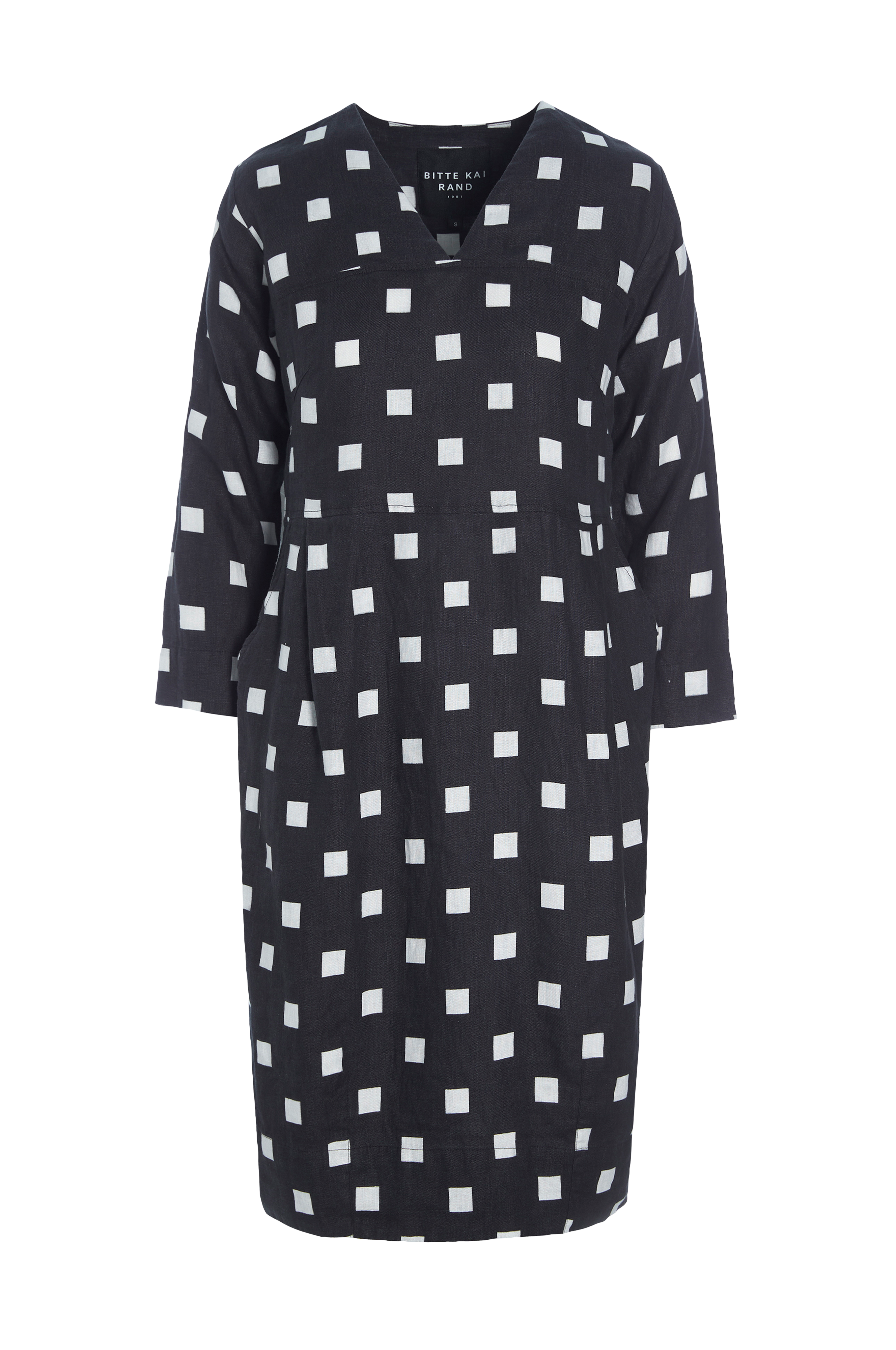 Klänning i linnekvalitet med grafiska rutor. V-ringad hals och ärmar i 3/4-längd. Två fickor. Längd 106 cm i stl XL.